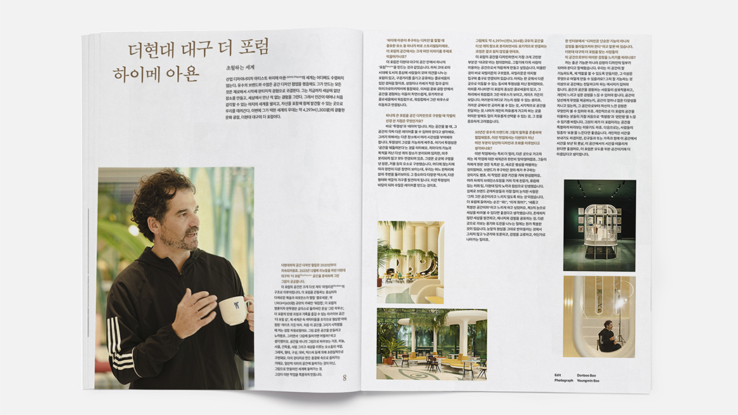 세상에 없던 장소를 만들고 세상에서 만난 적 없는 경험을 그리는 ‘하이메 아욘’은 ‘더현대 대구 더 포럼’을 통해 어떤 판타지를 담고자 했을까요? 세계적인 산업디자이너이자 아티스트인 하이메 아욘은 더현대 대구와의 협업을 통해 약 1,300평에 가까운 광활한 문화 광장인 더 포럼을 새로운 공간으로 재탄생시켰는데요. 하이메 아욘이 더 포럼을 통해 우리에게 어떤 이야기를 전하고자 했는지에 대한 자세한 이야기는 <에디토리얼 디파트먼트>에서 확인할 수 있습니다.