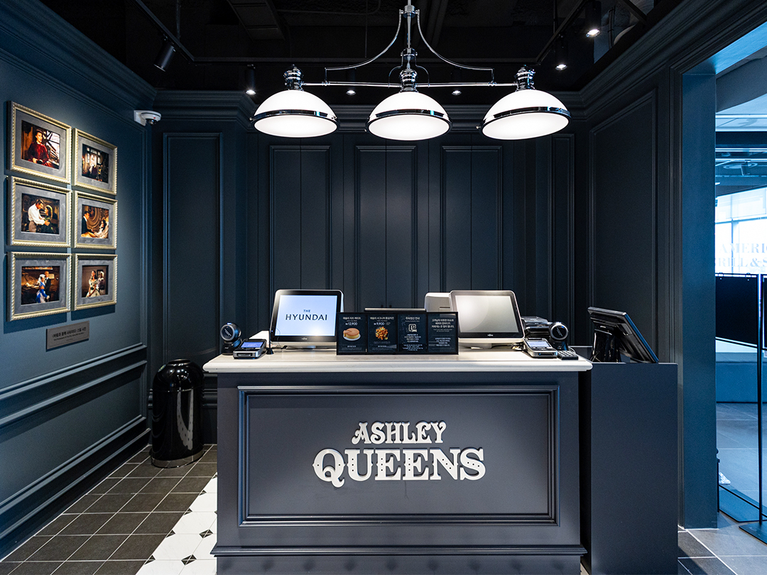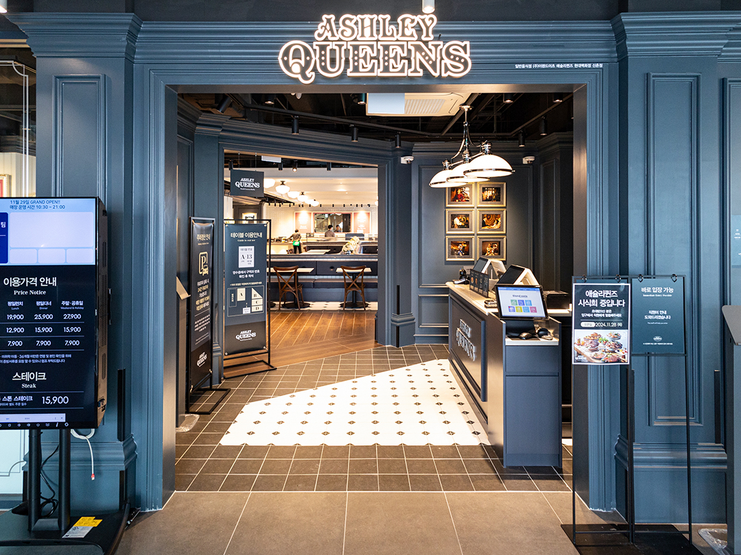 현대백화점 신촌점에 새롭게 문을 연 애슐리퀸즈 현대유플렉스 신촌점은 화이트와 네이비 톤이 조화를 이루는 고급스러운 인테리어와 빈티지 모던 콘셉트의 다양한 장식품들로 연말 모임을 즐기기에 안성맞춤인 공간으로 설계됐어요.