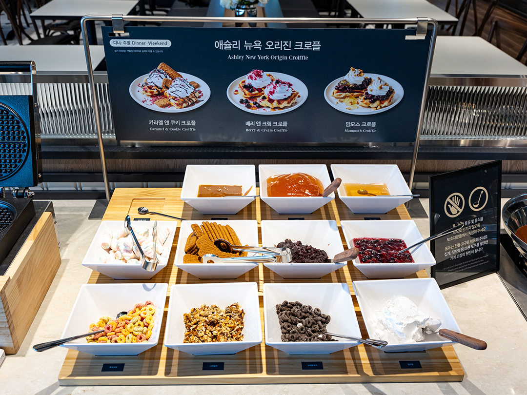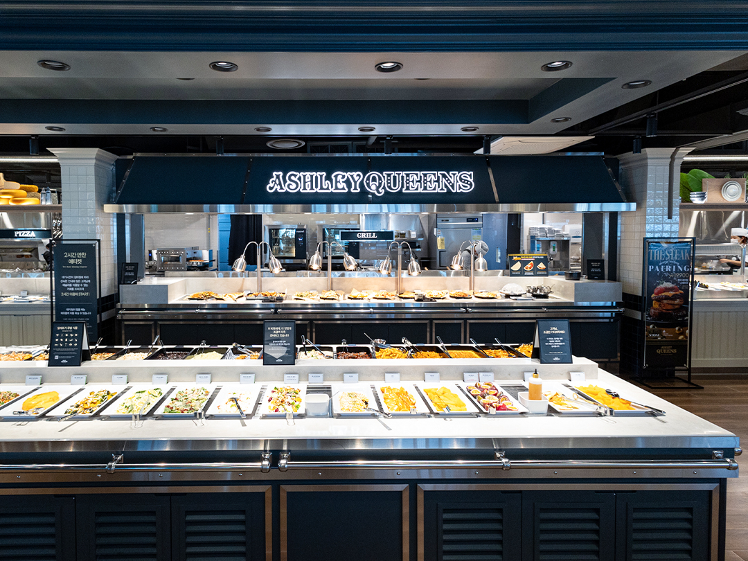 애슐리퀸즈는 전 세계 곳곳의 특색 있는 음식 100여 종을 한 곳에서 즐길 수 있는 월드 고메 뷔페입니다.
