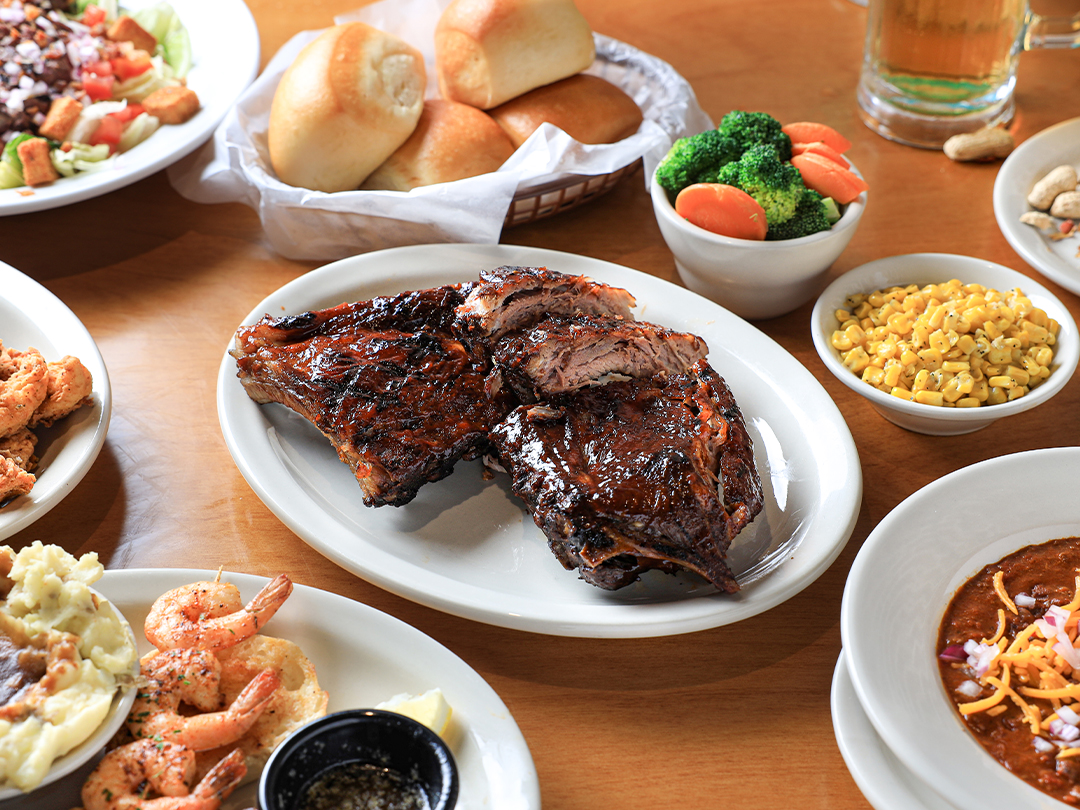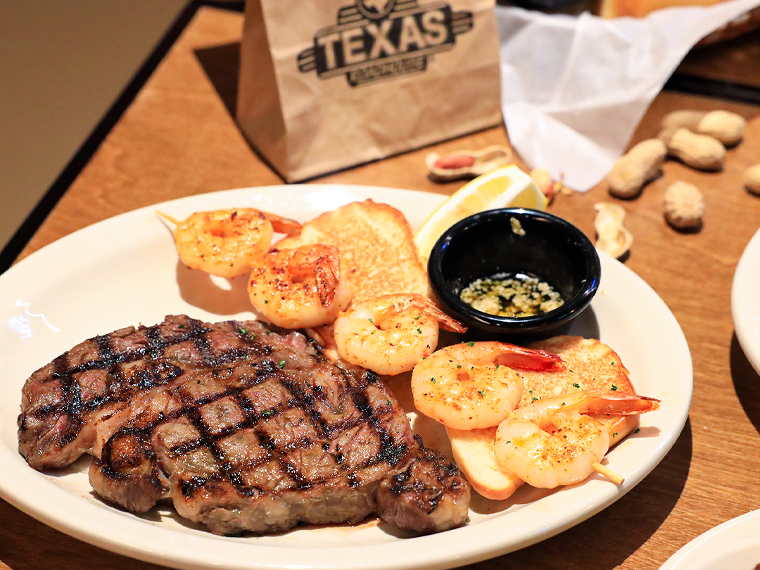 텍사스로드하우스 현대백화점 중동점에서 특히 사랑받는 메뉴는 12온즈 립아이 플래터인데요. 340그램 상당의 12온스 립아이와 그릴드 쉬림프, 그리고 6조각의 립은 입안을 고기와 새우의 진한 맛으로 가득 채워요.