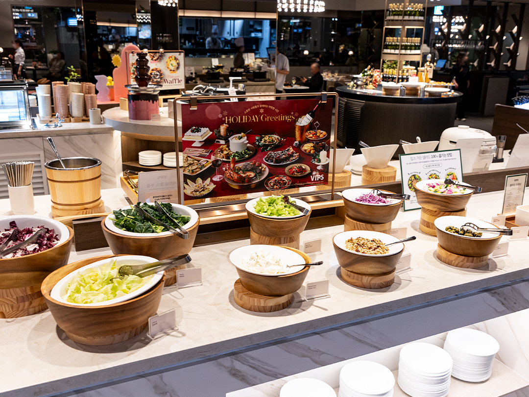VIPS 하면 계절에 따라 달라지는 샐러드바도 빼놓을 수 없는데요. VIPS 송파 현대 가든파이브점에서는 스패니시 갈릭 뽈뽀, 로스티드 페퍼 엔초비 등 연말을 맞아 출시된 ‘홀리데이 그리팅스(Holiday Greetings)’ 콘셉트의 다양한 겨울 신메뉴를 맛볼 수 있습니다.