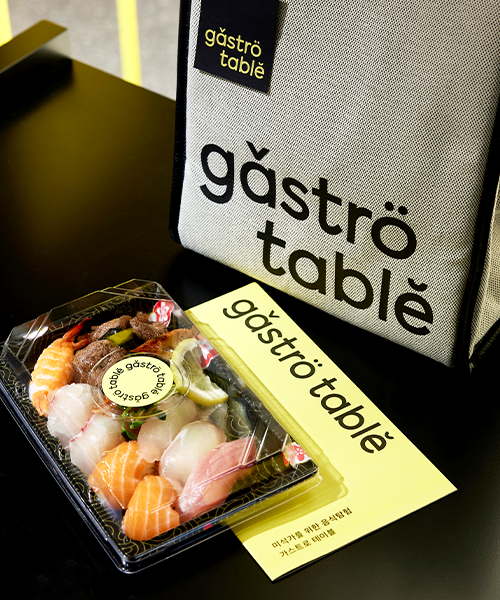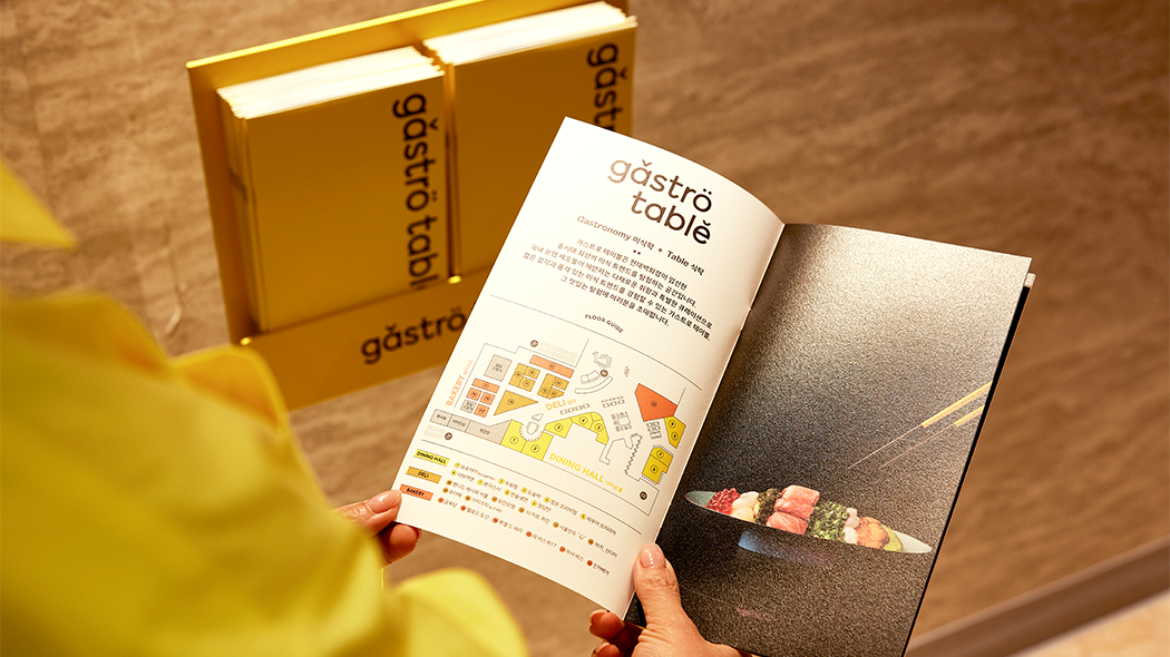 뿐만 아니라 ‘미식가들을 위한 음식 탐험’이라는 슬로건을 내세운 가스트로 테이블은 공간 곳곳에서 브랜드 아이덴티티를 확인해 볼 수 있는데요. 네이밍과 직원 유니폼, 카트를 포함하여 고객들에게 제공되는 브로셔와 종이 가방, 보냉백 등 모든 곳에 브랜딩을 가미했습니다. ‘프리미엄 다이닝 홀’이라는 브랜드 이미지를 고객들에게 꾸준히 전달하며 차별화된 식품관 플랫폼으로 다가가고자 합니다.