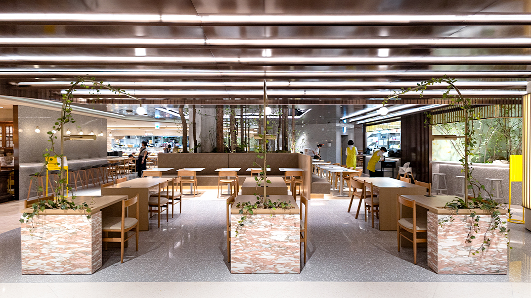 현대백화점이 2년 동안 준비한 프로젝트, 가스트로 테이블은 그리너리한 공간 디자인으로 눈길을 사로잡는데요. 일본 건축 사무소 시나토가 진행한 이번 리뉴얼은 고객들로 하여금 자연 속에서 식사하는 듯한 기분을 느낄 수 있도록 가드닝 인테리어를 적용하였습니다. 특히 화이트톤의 천장과 밝은 조명은 공간감을 확대하며 외부 정원과 같은 분위기를 완성해 줍니다.