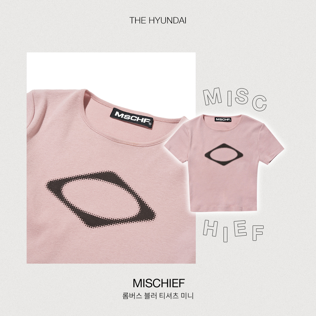 디자인 형태의 그래픽을 선호하는 사람은 미스치프의 티셔츠도 눈여겨보세요. 마름모꼴 형태의 블러 처리된 그래픽이 가운데에 감각적으로 새겨져 있는 아이템인데요. 길이감이 경쾌한 크롭탑 디자인이라 로우웨이스트 스타일의 팬츠나 스커트와 함께 매치하면 좀 더 힙하게 연출할 수 있습니다.