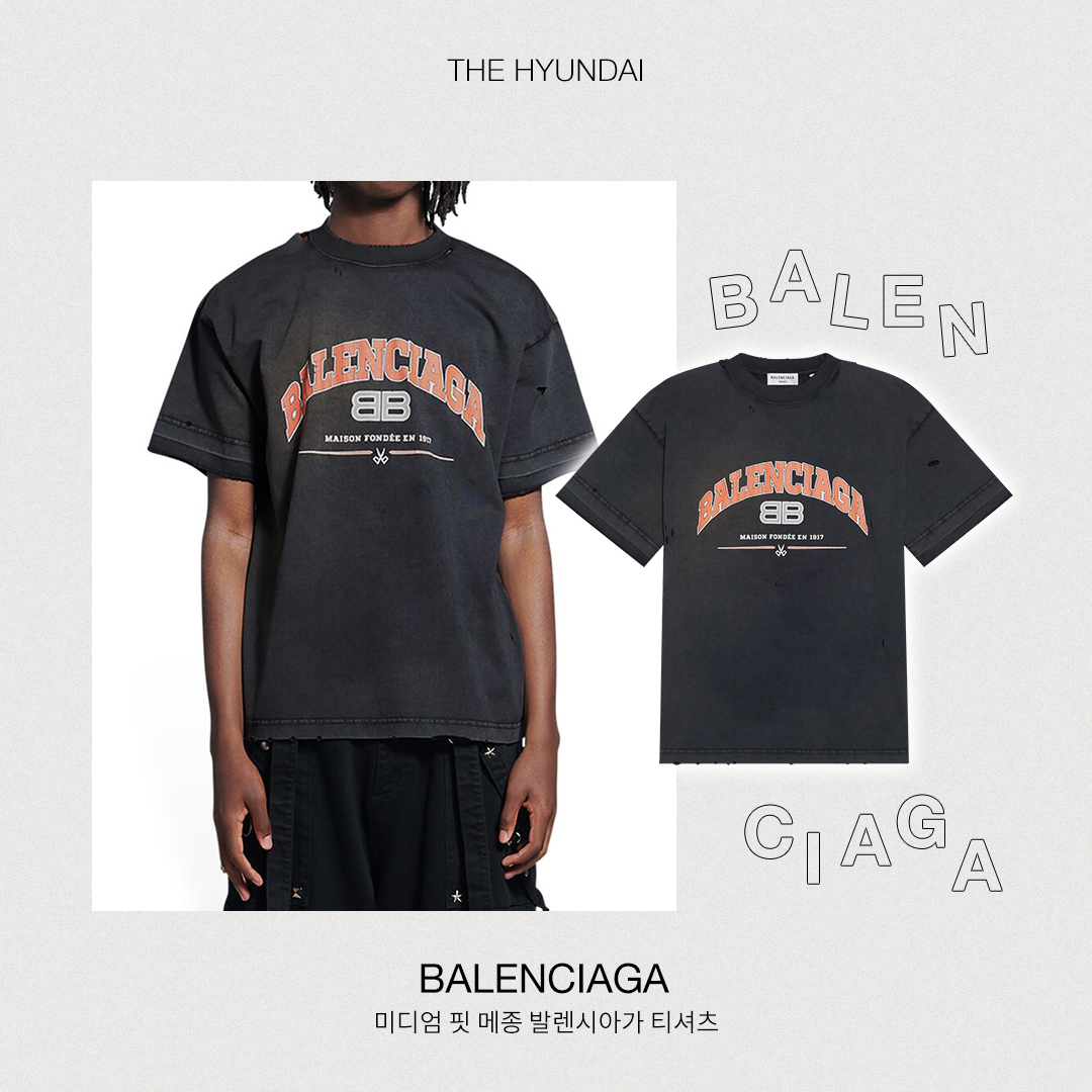 평소 힙한 스타일을 즐겨 입는다면 발렌시아가의 티셔츠를 선택해 보세요. 빈티지 스타일의 크루넥 티셔츠로 발렌시아가의 로고를 활용한 아트워크가 프린트되어 있습니다. 자연스럽게 낡은 효과를 내기 위해 직물 전면에 리핑이 되어 있는 것 마저 세련된 감각이 느껴지네요.