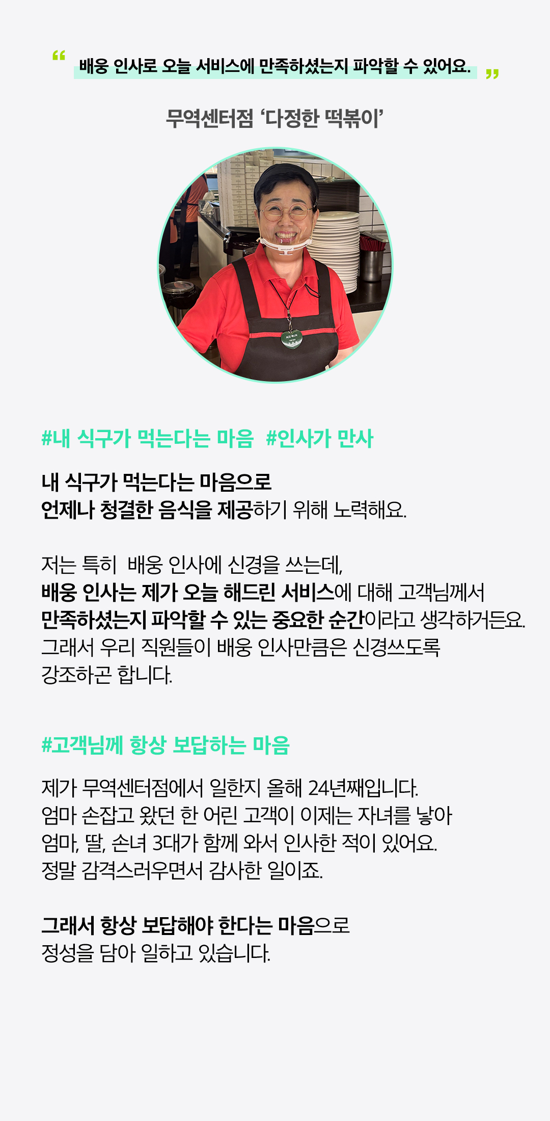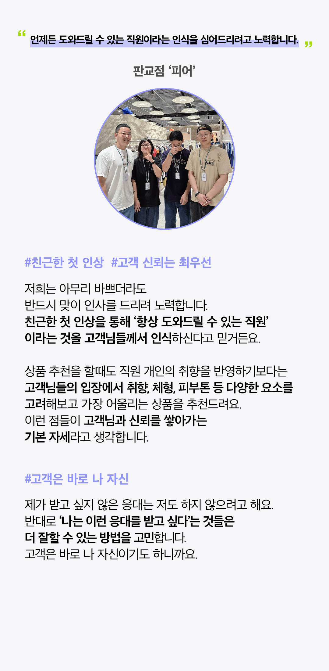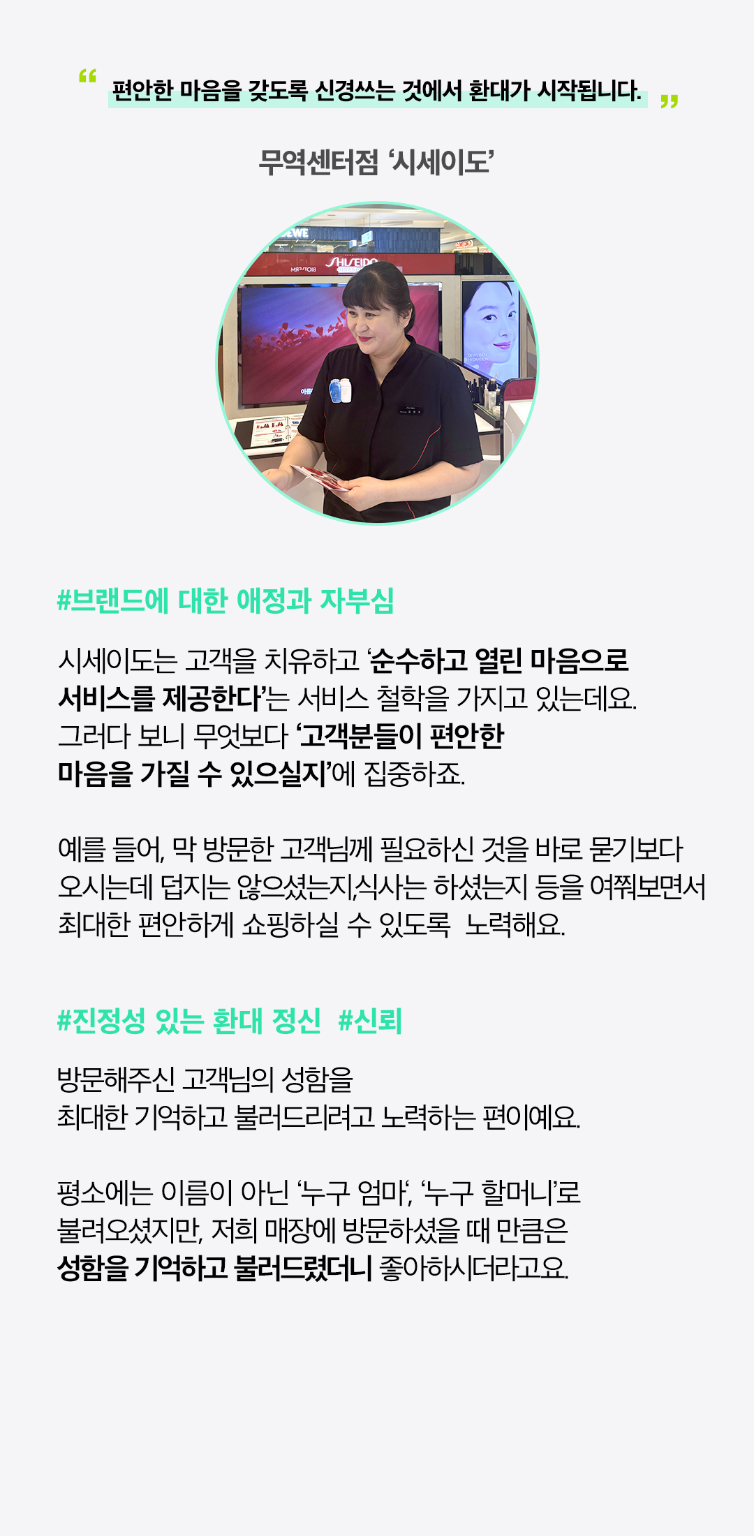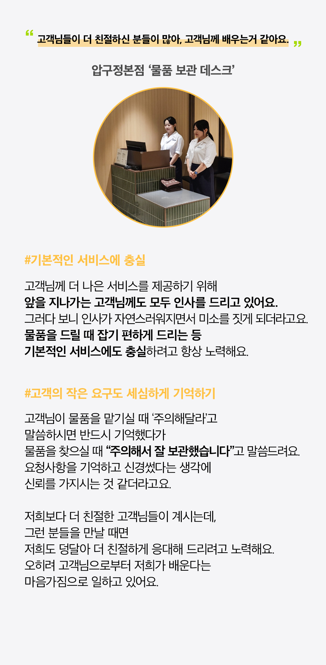 현대백화점은 ‘고객 행복’ 이라는 가치를 실현하기 위해 항상 최선의 노력을 다하고 있는데요. ‘서비스 장인’이라고 불릴 만큼 우수한 고객 서비스를 제공하는 직원들이 ‘고객 행복을 실천하기 위해 어떤 노력을 기울이는지’, ‘더 나은 서비스를 위해 어떤 마음가짐으로 근무하고 있는지’ 고객 여러분들도 궁금하지 않으신가요? 2024년 현대백화점 서비스 우수 브랜드 및 편의 서비스 시설에서 일하고 있는 직원들의 서비스에 대한 고민과 철학을 들어보았습니다. 지금부터 그 생생한 이야기를 전해드리겠습니다.
