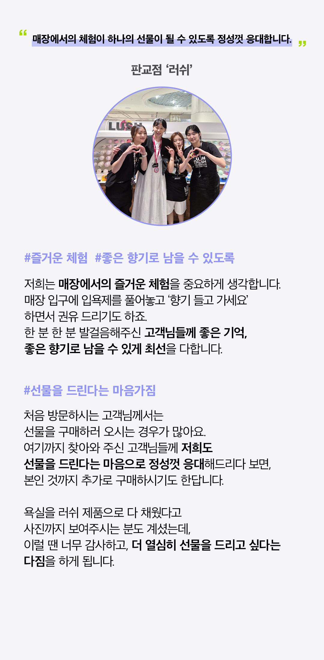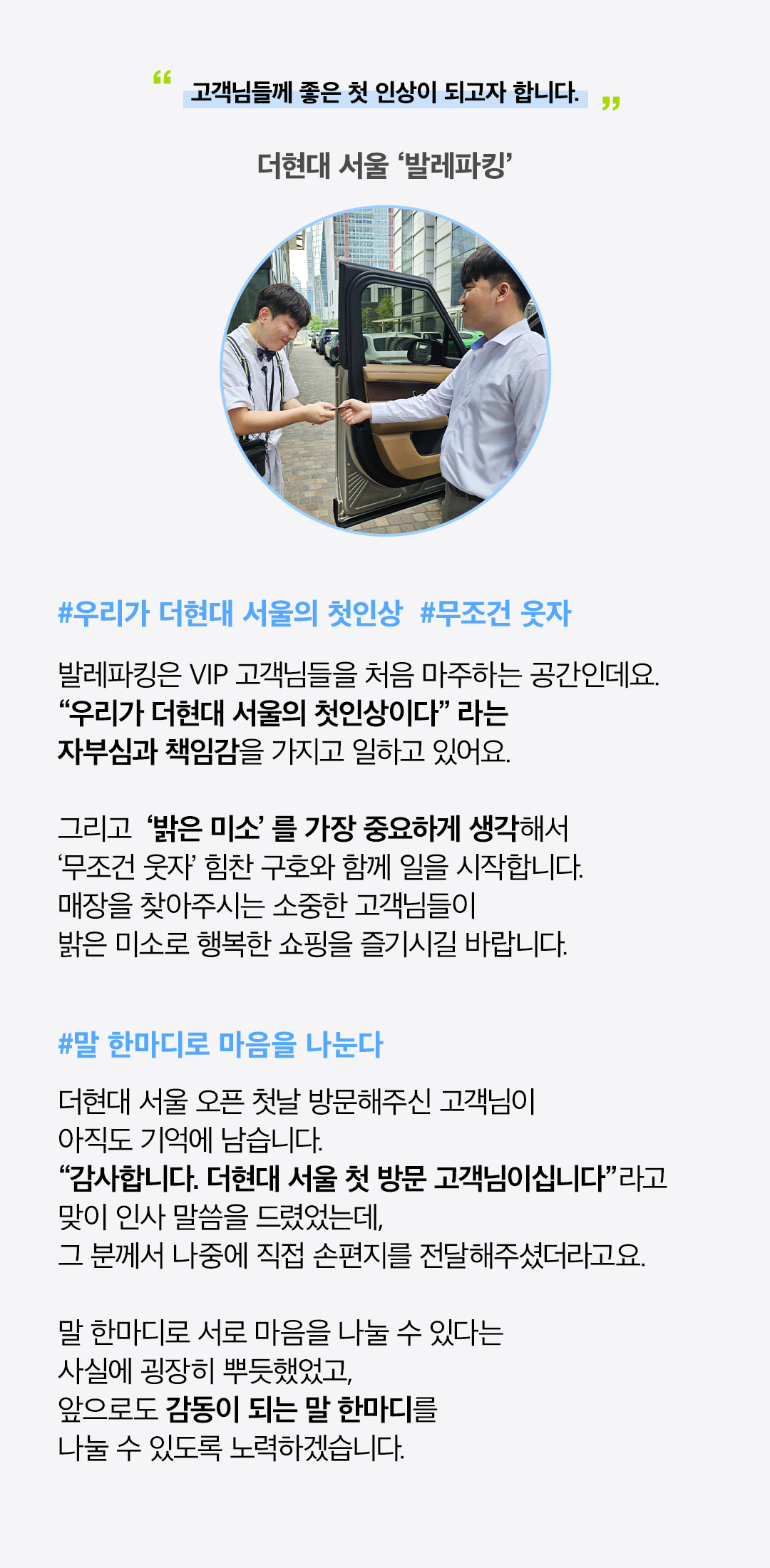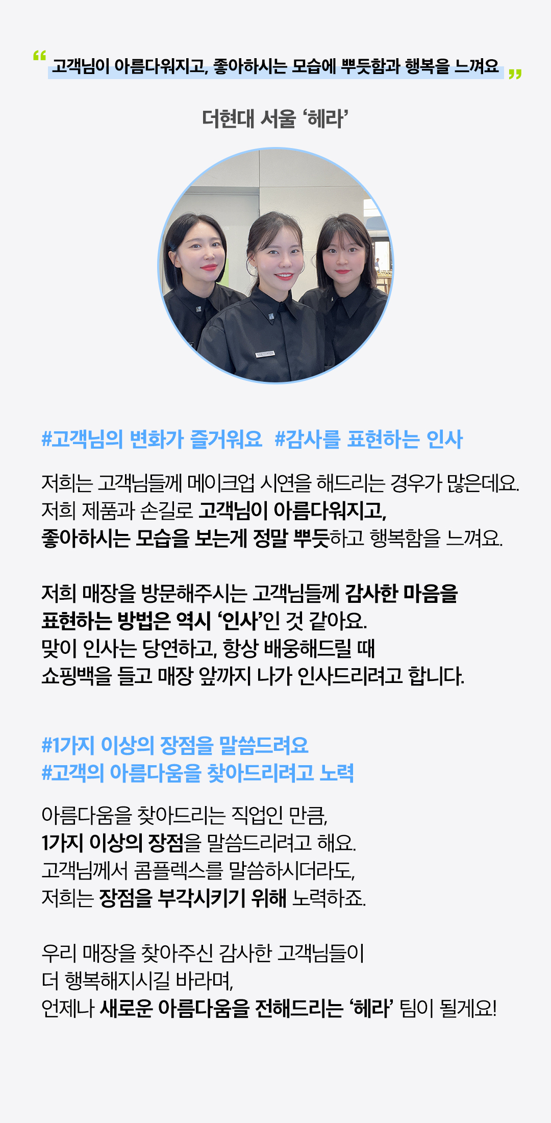 ‘남을 행복하게 할 수 있는 사람만이 행복을 얻을 수 있다’ 는 플라톤의 명언이 있듯, 현대백화점은 고객님들께 친절하게 다가가 행복을 전달하고 서비스에 만족해하시는 모습들을 보며 뿌듯함과 행복함을 느끼고 있습니다. 언제나 밝은 미소와 친절한 서비스로 최상의 행복을 전달해 드릴 것을 약속드리며, 앞으로 현대백화점의 행보에도 많이 기대해 주세요!