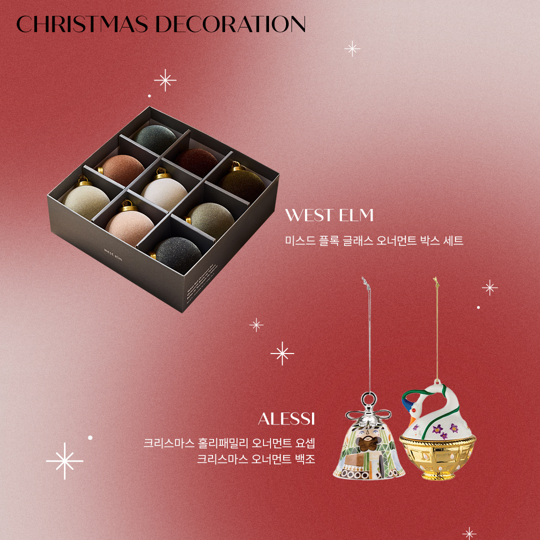 매년 돌아오는 크리스마스의 시작을 알리는 것이 있다면 단연 초록색과 빨간색, 그리고 반짝거리는 조명과 같은 장식들이 아닐까요? 공간 곳곳에 자리한 크리스마스 장식 아이템들과 함께 12월 25일을 기다리는 것 또한 이달에만 느낄 수 있는 설렘입니다. 남은 한 달을 더욱 행복하게 만들어 줄 크리스마스 장식 아이템들을 소개합니다.