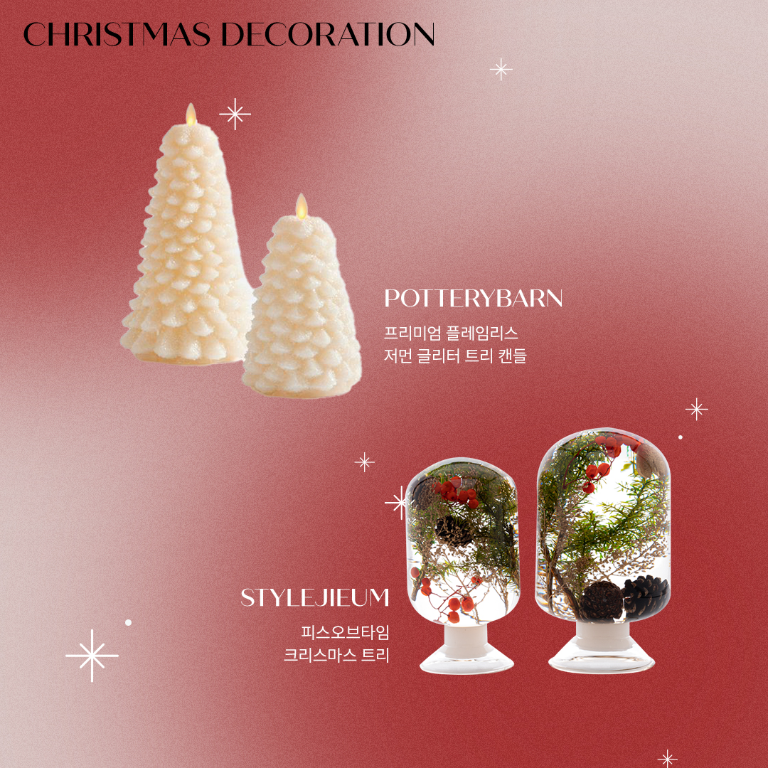 매년 돌아오는 크리스마스의 시작을 알리는 것이 있다면 단연 초록색과 빨간색, 그리고 반짝거리는 조명과 같은 장식들이 아닐까요? 공간 곳곳에 자리한 크리스마스 장식 아이템들과 함께 12월 25일을 기다리는 것 또한 이달에만 느낄 수 있는 설렘입니다. 남은 한 달을 더욱 행복하게 만들어 줄 크리스마스 장식 아이템들을 소개합니다.