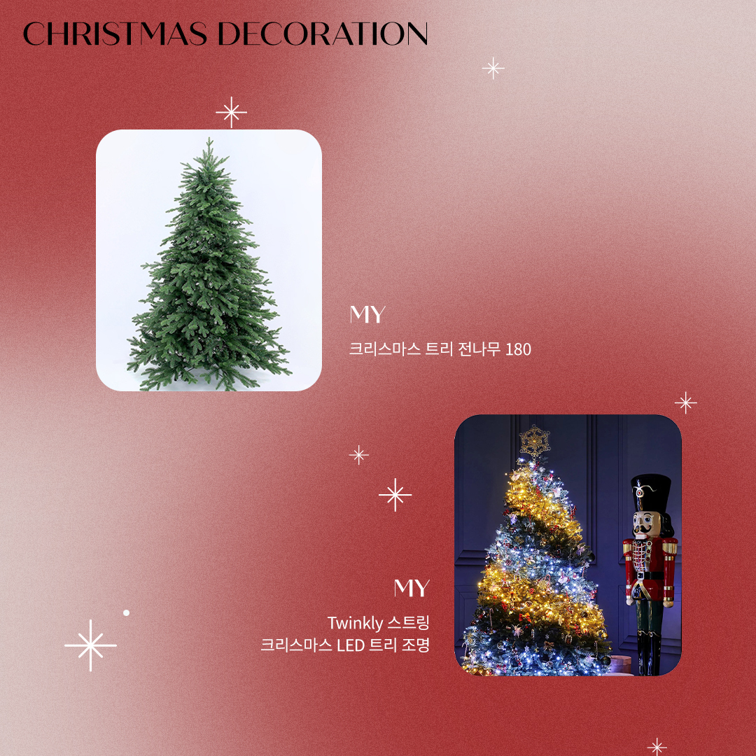 엠와이 크리스마스 트리 전나무 180 엠와이의 크리스마스 트리는 기본 전나무 형태를 가지고 있어, 어떤 오너먼트와 조명을 활용하는지에 따라 다양한 분위기를 연출할 수 있는데요. 소중한 사람이 설레는 마음으로 크리스마스를 기다릴 수 있도록 트리를 선물해 보세요. 제품 바로가기