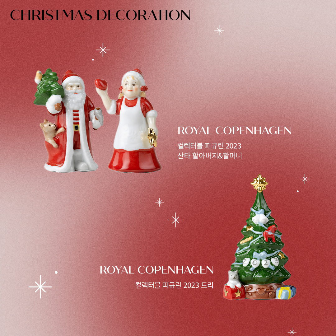 로얄코펜하겐 컬렉터블 피규린 2023 산타 할아버지&할머니 로얄코펜하겐의 컬렉터블 피규린은 매년 특별한 디자인으로 출시되는데요. 이번 크리스마스 시즌에는 산타 디자인의 컬렉터블 피규린이 준비되어 있으며, 어딘가에 올려두는 것만으로도 따뜻한 연말 분위기를 완성할 수 있습니다. 소중한 사람이 더 풍성하고 아늑한 크리스마스 분위기를 즐기길 바라는 마음을 담아 선물하기 좋아요. 할아버지 제품 바로가기 할머니 제품 바로가기