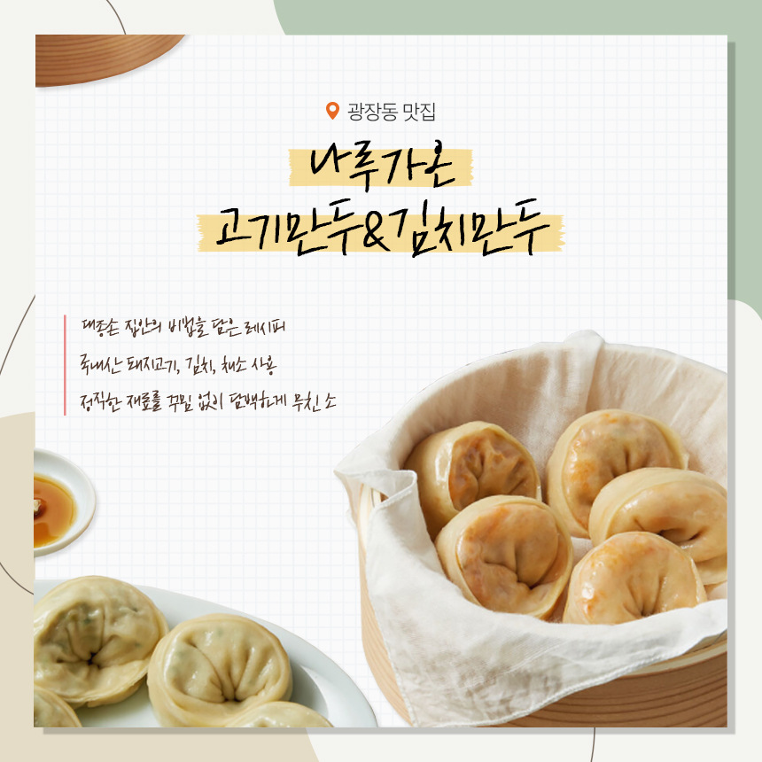 대종손 집안에서 4대째 전해 내려오는 조리법 그대로, 전통 방식을 고수하는 만둣집이 있습니다. 얇게 민 피에 소를 넣고 손으로 빚은 만두는 옛날 엄마나 할머니가 해주시던 손만두와 같은 형태를 가지고 있는 데다 정직한 재료를 가득 넣은 속이 꽉 찬 만두의 소는 뛰어난 맛만큼이나 가득한 정성을 느끼게 합니다. 찐만두로 즐기기도 좋고, 만둣국에 넣어 먹어도 좋은 나루가온의 고기만두. 현대백화점 투홈에서 만나보세요. 고기만두 7,500원 ☞ 구매하기 / 김치만두 7,500원 ☞ 구매하기