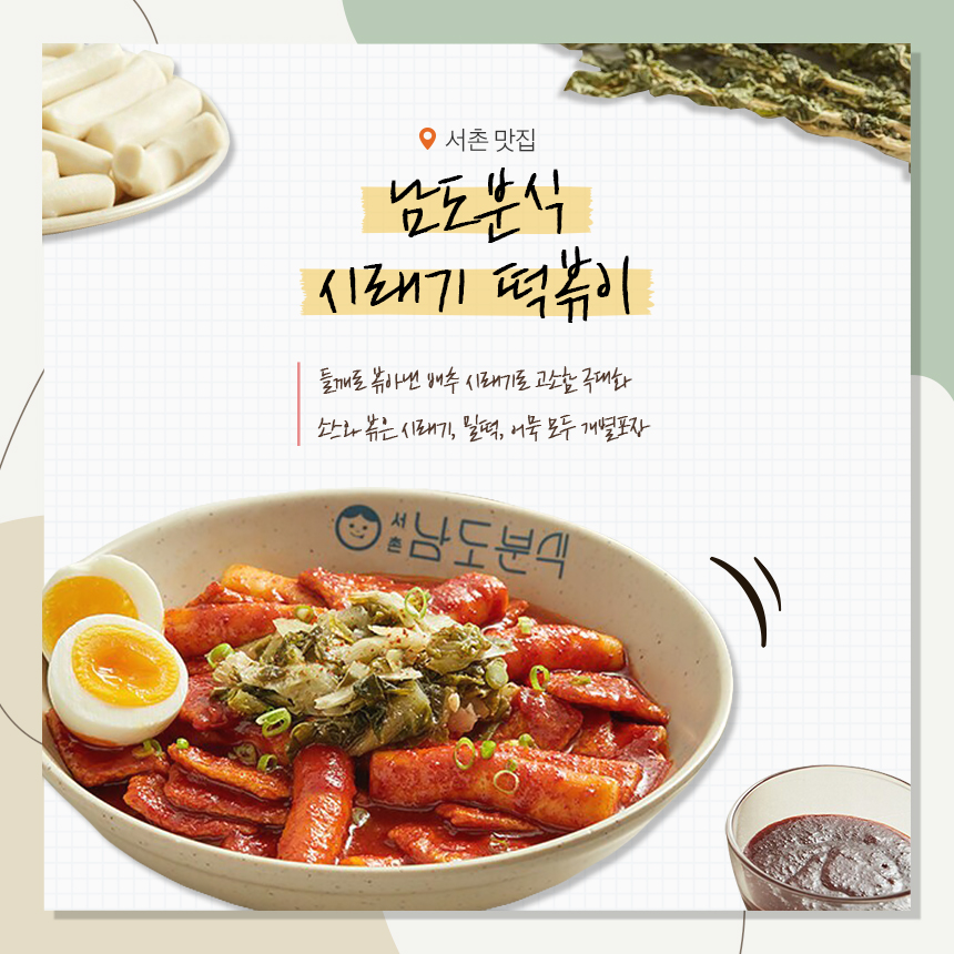 서촌의 핫플레이스 ‘남도분식’을 줄 서지 않고도 먹을 수 있는 법을 소개합니다. 전국 각지 이름난 분식들을 재해석한 메뉴로 사랑받는 남도분식. 그중에서도 시래기 떡볶이는 옛날 떡볶이의 향취와 새로운 맛을 결합하여 많은 사랑을 받는 남도분식의 대표 메뉴 중 하나입니다. 매콤 달콤한 떡볶이에 들깨와 함께 볶은 배추 시래기를 올려 구수하면서도 시원한 맛을 더해주었어요. 식용유를 두른 팬에 소스를 먼저 볶고 자박자박하게 끓는 물에 떡, 어묵, 시래기 순으로 넣고 끓여주세요. 더 이상 줄 서서 기다릴 필요가 없답니다. 6,550원 ☞ 구매하기