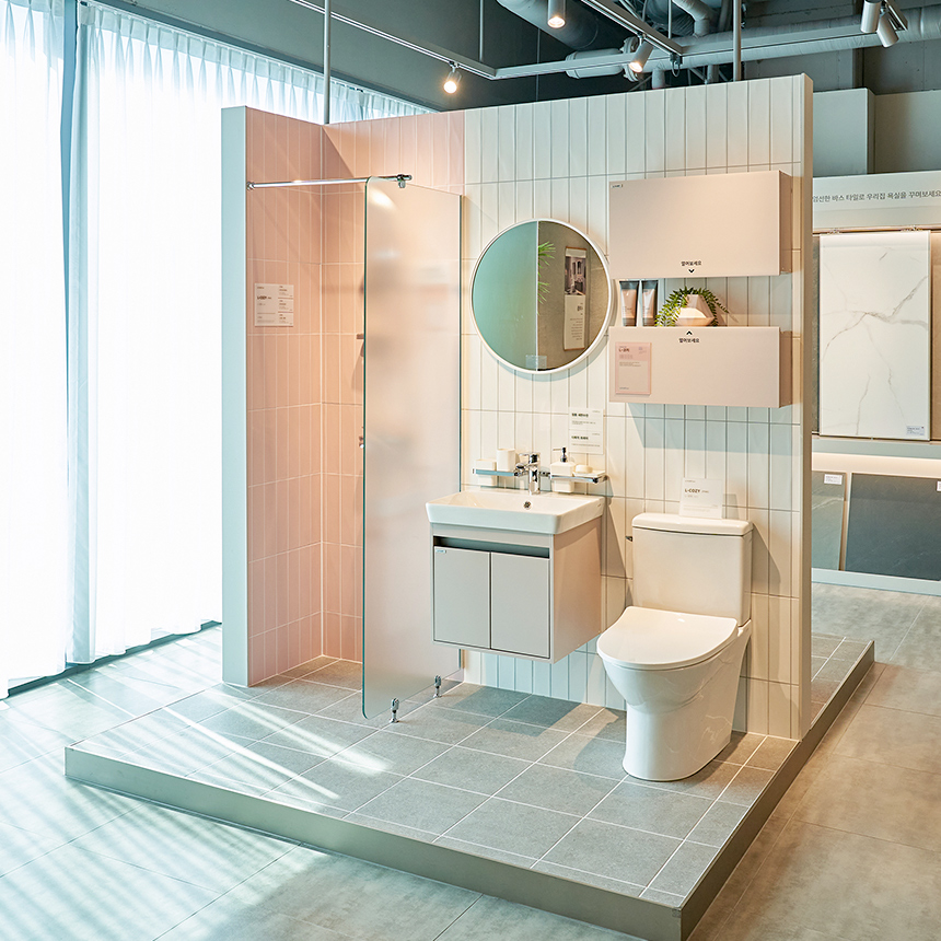 밝은 채광 속 산뜻한 핑크가 돋보이는 ‘L-코지’는 화이트 베이스에 부드러운 색감을 더해 편안한 욕실을 보여줍니다. 핑크 컬러의 욕실장, 화이트 포인트 타일, 그리고 다시 샤워부스의 핑크 타일로 이어지는 톤온톤 매칭이 ‘L-코지’만의 차별성을 잘 보여주네요. 그린 컬러도 준비되어 있으니 ‘리바트 플래너’와 함께 확인해보세요.