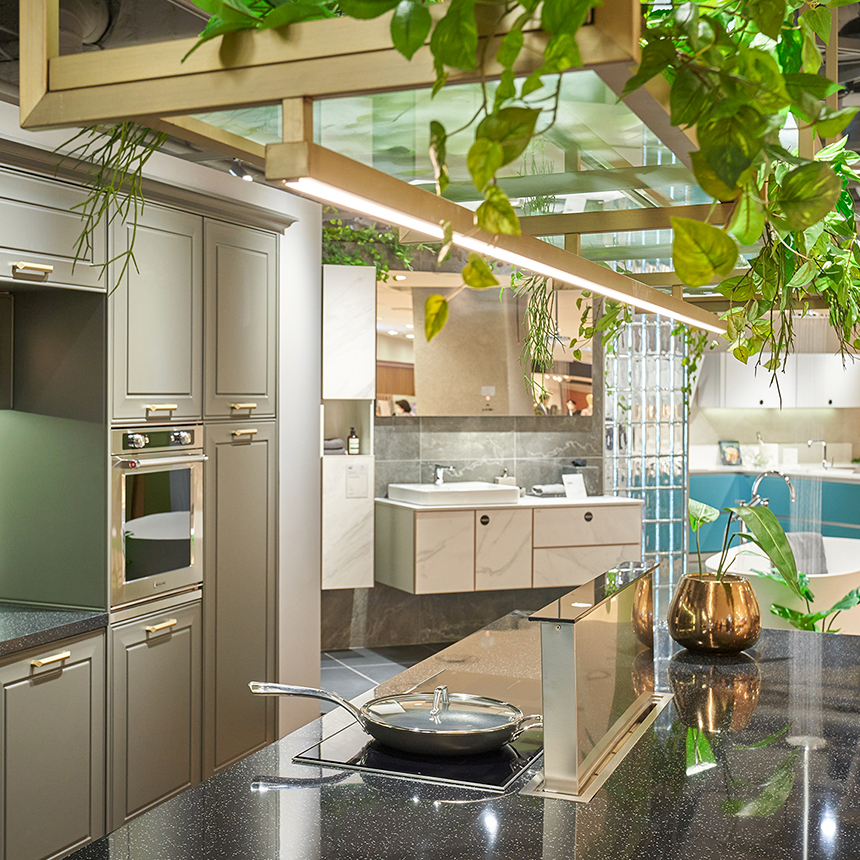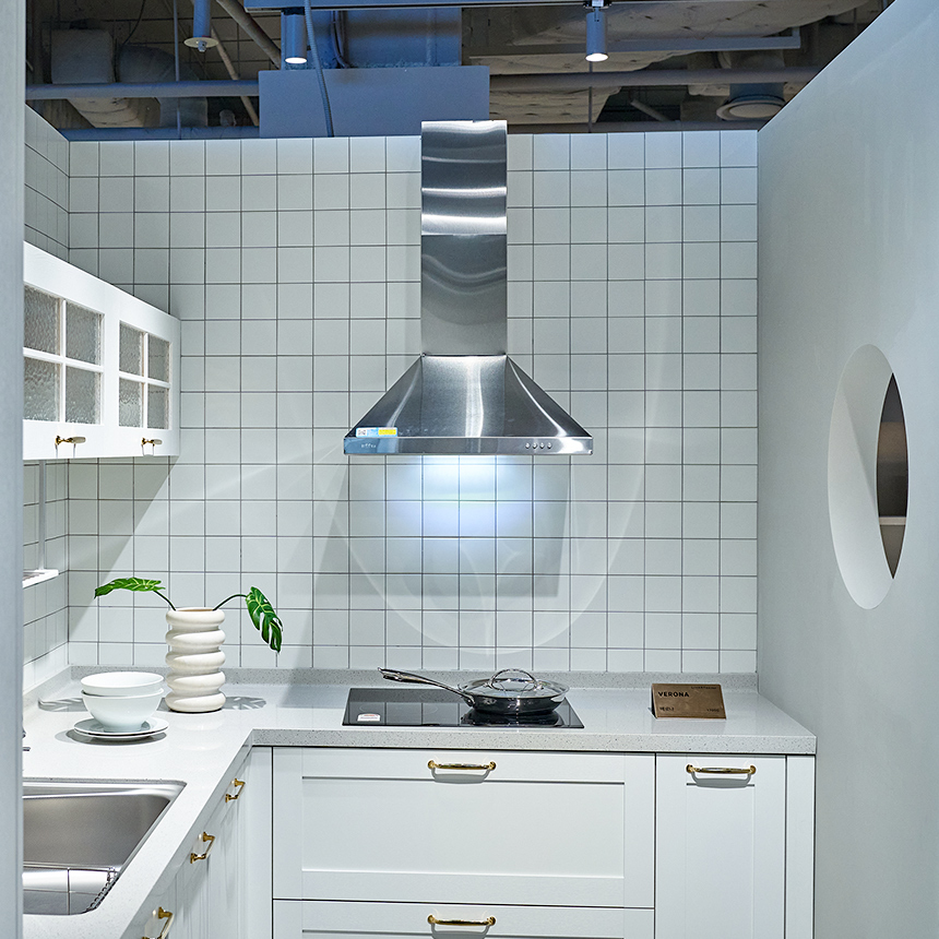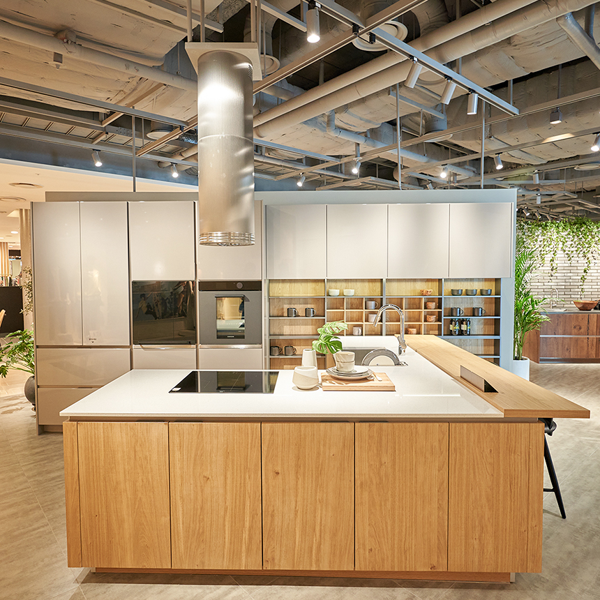 먼저, 매장 입구의 고급스러운 아일랜드가 눈길을 사로잡는데요. 독립형 아일랜드에 설치된 와이드 쿡탑으로 요리는 편리하게, 동선은 효율적으로 만들어보세요. 여기에 사용 후 감쪽같이 사라지는 다운 드래프트 후드를 더하면 공간도 넓게 쓰고 심플한 아름다움은 더해집니다.