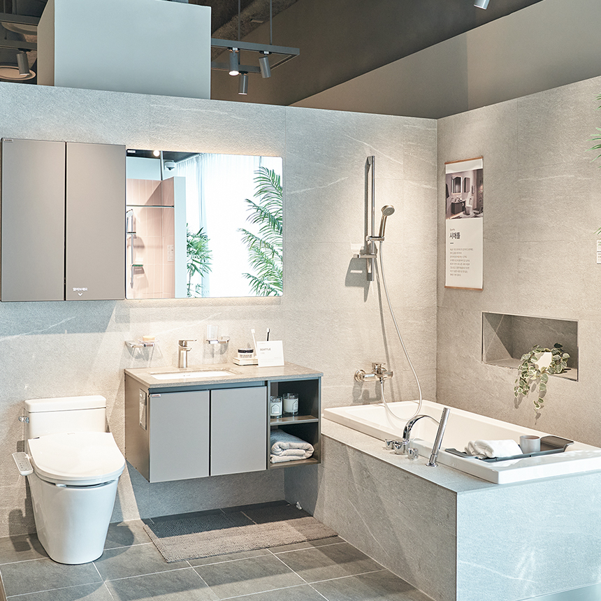 ‘시애틀’은 시크한 그레이톤과 넓은 스케일감으로 모던한 감각을 한껏 올렸습니다. 넓은 바닥 타일은 욕실 공간을 더욱 넓고 쾌적하게 만들어 주고 벽타일에는 자연스러운 질감이 살아있네요. 간결함과 모던함이 드러나는 수전과 액세서리는 고급 호텔을 떠올리게 하죠. 도드라지지 않는 언더 카운터 세면대와 매립 욕조의 일체감까지, ‘시애틀’은 여행에서 누리는 것과 같은 휴식을 더해줍니다.