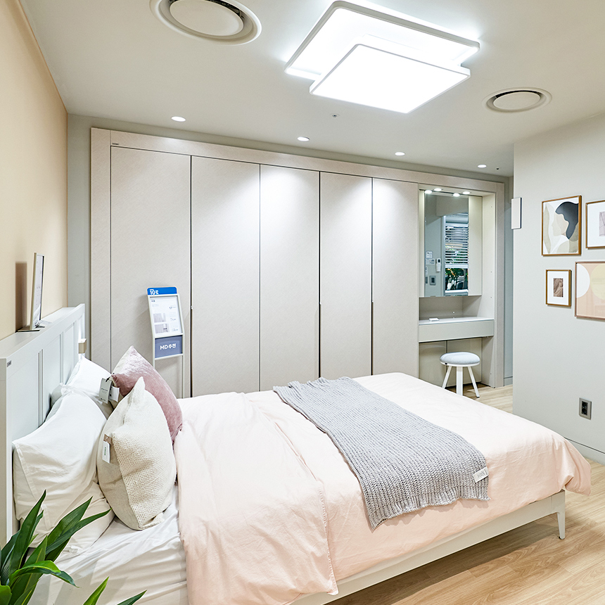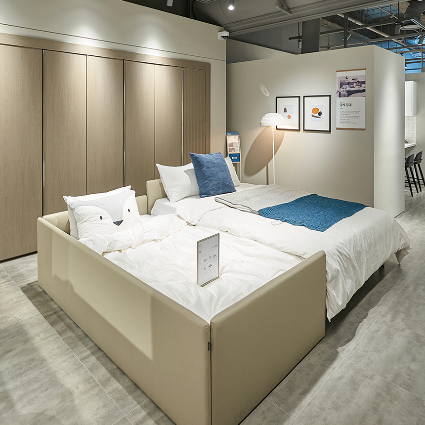 침실에 꼭 필요한 붙박이장과 화장대가 같이 배치되어 함께 확인할 수 있는 침실존에서는 이 침대를 꼭 주목해주세요. 두 개의 침대가 붙어 있는 독특한 형태의 침대, ‘당케 침대’는 출산을 앞두었거나 유아를 둔 가정에 최적인 침대입니다. 낮은 높이와 쿠션형 헤드로 아이에게는 안전하고, 아이가 자라 수면 독립을 하게 되면 작은 침대를 간단하게 분리할 수 있으니 실용성과 실속 면에서도 최고의 선택입니다.