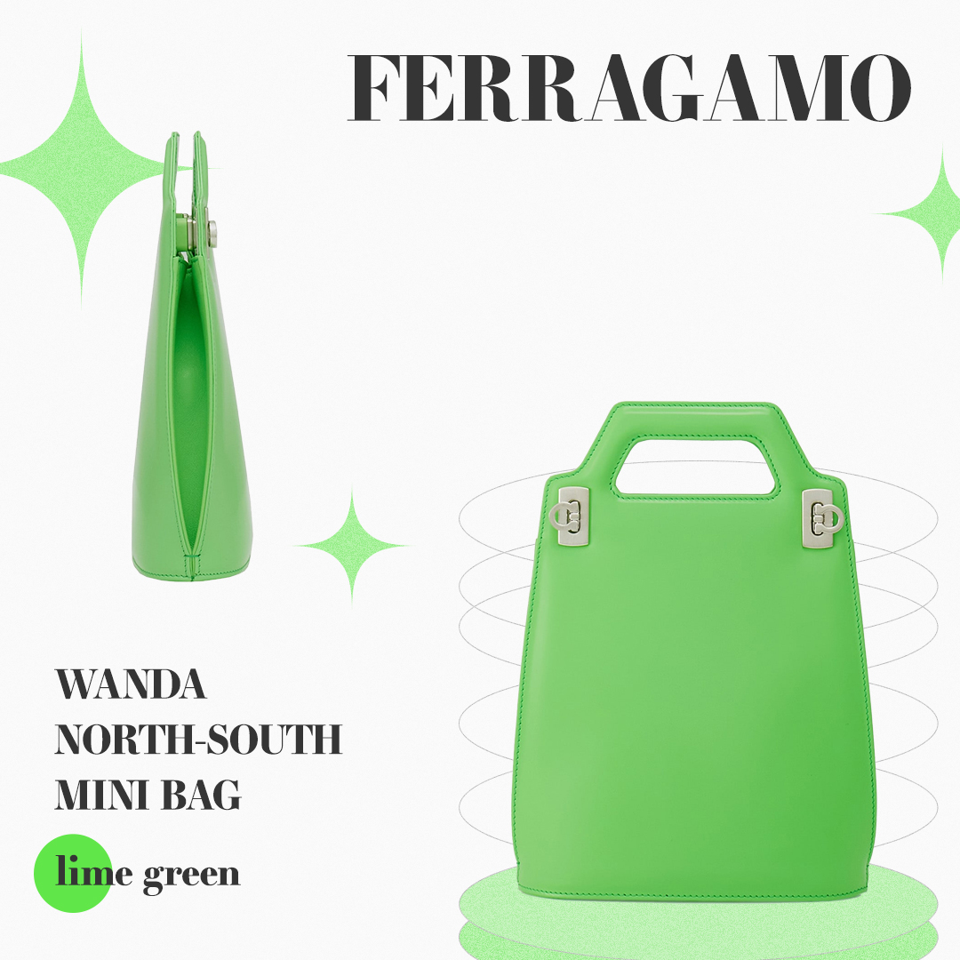 페라가모의 완다 노스사우스 미니백은 정제된 스타일의 단아함과 라임 그린 컬러의 키치함까지 갖추고 있는데요. 기하학적인 형태의 바디와 탑 핸들이 연결된 것이 특징이며, 전면의 상단의 더블 간치니 로고 포인트가 시선을 사로잡습니다. 깔끔하면서도 플랫한 디자인의 미니 백을 선호한다면 페라가모 미니백이 좋은 선택이 되겠네요.