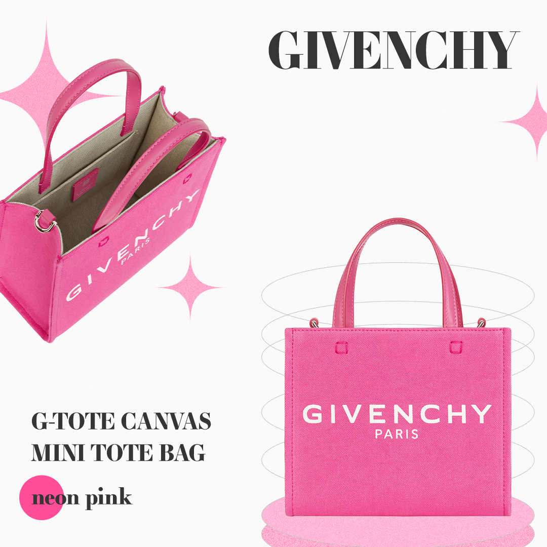 일상에서 가볍고 편하게 들고 다닐 미니백을 찾고 있다면 캔버스 소재의 백을 골라보는 것도 좋습니다. 지방시의 G-Tote 미니 토트백은 숄더백과 크로스백으로 모두 활용 가능하며, 핑크 컬러에 화이트 로고 포인트가 돋보이는 디자인인데요. 미니 사이즈이지만 내부에 플랫 포켓이 있어 소지품을 구분해서 보관하기 편리합니다.
