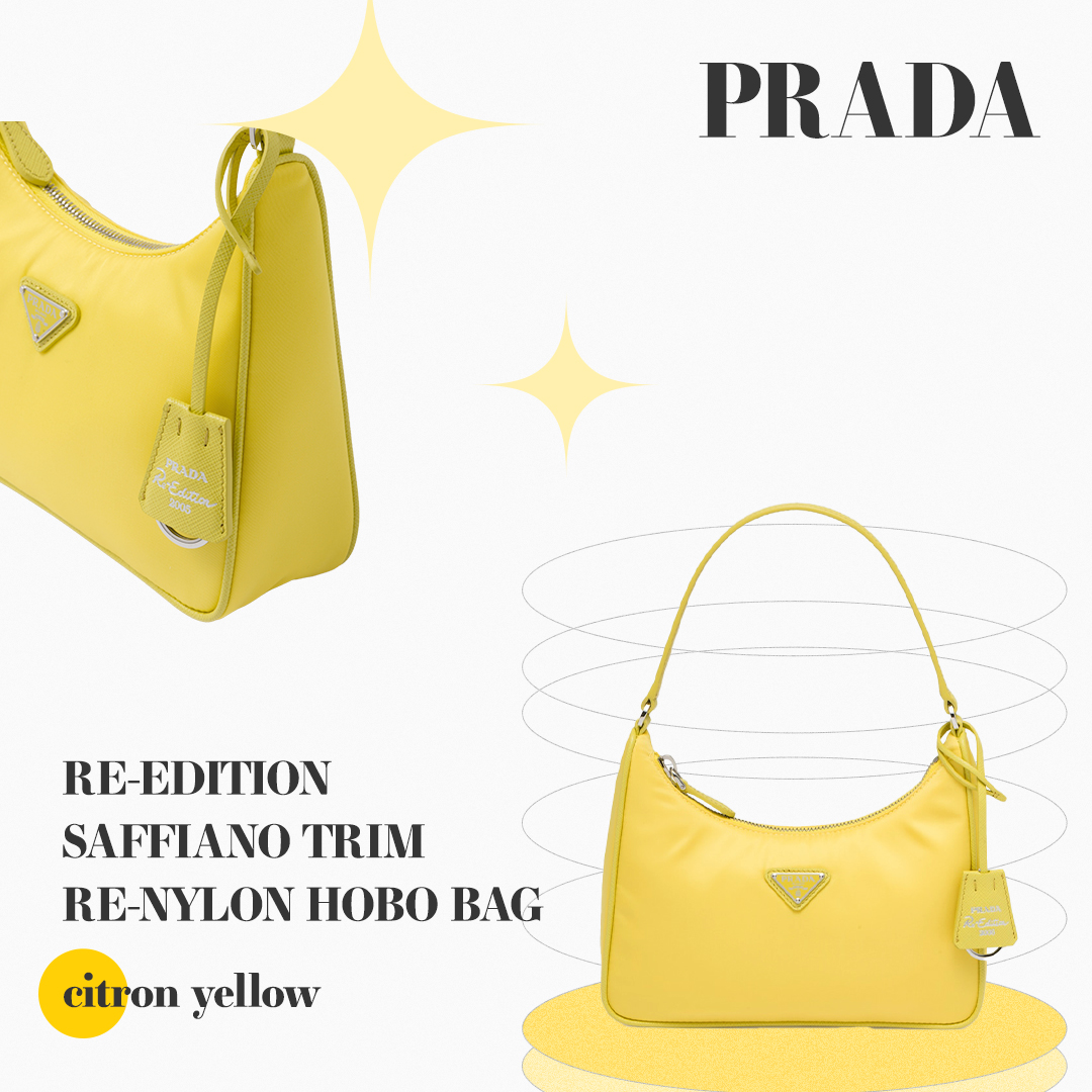 아이코닉한 스타일의 미니 호보 백에서 영감을 얻어 재탄생시킨 프라다 리에디션 2005 컬렉션입니다. 바다에서 수거한 플라스틱과 어망 등을 정화해서 얻은 재생 소재로 제작되어 환경적으로도 의미가 있는 가방인데요. 익숙한 디자인이지만, 흔히 볼 수 없는 비비드한 옐로우 색상과 D 고리에 연결된 가죽 트리밍이 가방을 더욱 특별하게 만들어 줄 거예요.