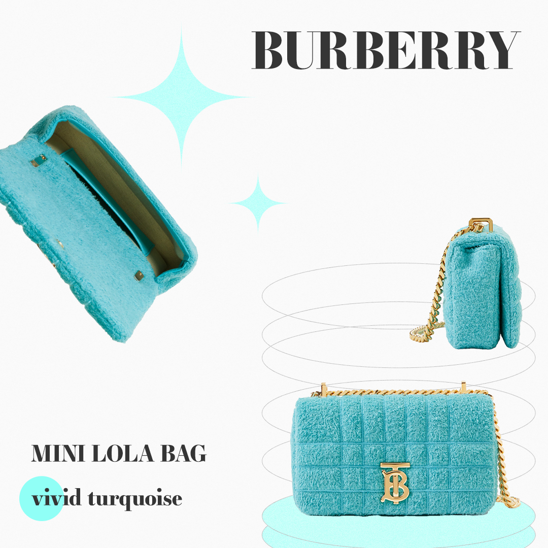 이번 여름, 테리 소재 아이템에 빠지신 분들 많으시죠. 버버리의 미니 롤라백은 싱그러운 컬러의 타월 소재로 되어 있는데요. 독특한 질감과 함께 촉감도 부드러워 유니크한 스타일을 연출하기에 효과적입니다. 수작업으로 제작된 금색의 체인 숄더 스트랩이 앞면의 로고와 함께 가방 전체에 포인트를 더해주어 더욱 특별한데요. 버버리의 기존 체크 무늬가 단조롭게 느껴진다면, 미니 롤라백을 시도해 보는 것을 추천합니다.