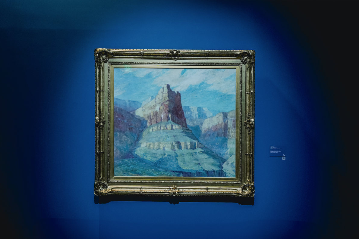 드윗 파샬Dewitt Parshall’의 작품 <허밋 크릭 캐니언>은 인상주의 기법을 사용해 건조한 풍경을 묘사한 드문 예시입니다. 보통 인상주의 작품들은 대부분 프랑스, 독일, 미국(뉴잉글랜드) 등 대부분 습한 기후의 풍경을 많이 그려서 공기 속에 마치 습기가 담겨 있는 것처럼 보입니다. 미국 남서부는 극도로 건조한 지역인데, 그런 환경에 인상주의적 기법을 적용했다는 점이 정말 뛰어난 지점입니다. 관객 분들이 꼭 이 작품을 주의 깊게 감상하길 소망합니다.