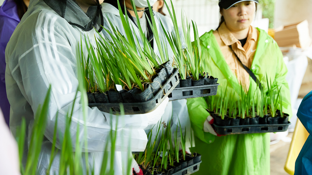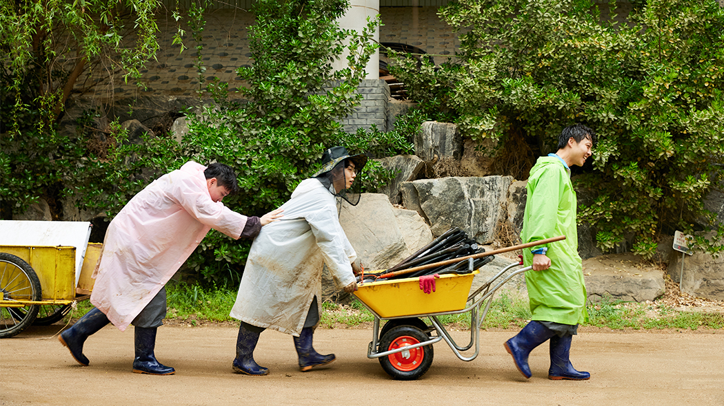 첫 번째 작업 창포 심기는 수레를 끌고 십여 분 걸어 도착한 연못가에서 진행되었습니다. 창포란 오염된 수질을 정화해 줄 수생식물인데요. 연못에 발을 담그고 물가의 흙을 걷어낸 다음 삽으로 푹 퍼낸 자리에 창포를 심는 활동이었어요. 포인트는 ‘너무 깊지 않게, 똑바로 세워서, 한 뼘 간격으로’ 심는 것이었고요. 발목까지 물에 잠기고 진흙투성이가 되었는데도 다들 개의치 않고 허리 굽혀 창포를 심었습니다.