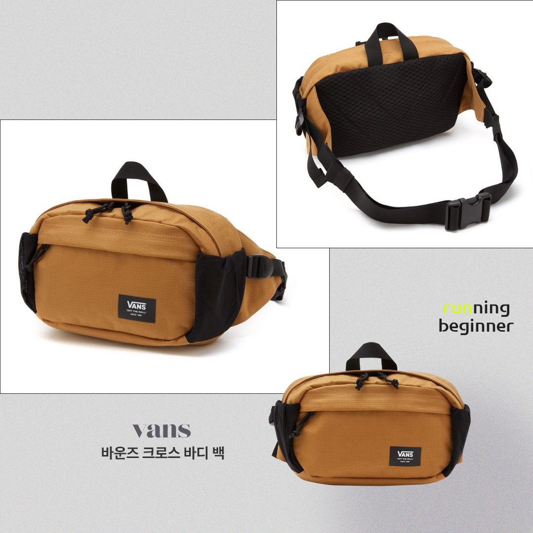 러닝을 할 때는 물티슈나 휴대폰, 카드 지갑 같은 가벼운 소지품을 넣을만한 가방이 필요합니다. 너무 크거나 야외에서 사용하기 불편한 소재여서도 안되겠죠. 반스의 크로스바디 백은 크고 작은 지퍼 포켓이 2개 있고, 사이드 아웃 포켓까지 있어 수납 공간이 여유롭습니다. 스트랩의 길이를 조절해서 어깨나 허리에 착용하면 방해받지 않고 러닝하기에도 좋아요. 제품 바로가기