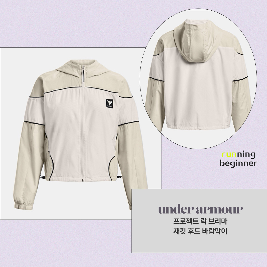 화이트와 아이보리 컬러 바탕에 블랙 라인이 감각적으로 들어간 이 바람막이 재킷도 좋은 선택이 되어줄 것 같습니다. 후드가 달려 있어 러닝을 하다가 날이 춥거나 갑자기 비가 조금씩 내릴 때도 유용하게 입을 수 있어요. 발수 기능과 통기성을 제공하는 UA 스톰 기술을 장착했으며 우븐 소재를 사용해서 착용감이 부드러운 데다가 내구성 또한 우수한 아이템이에요.