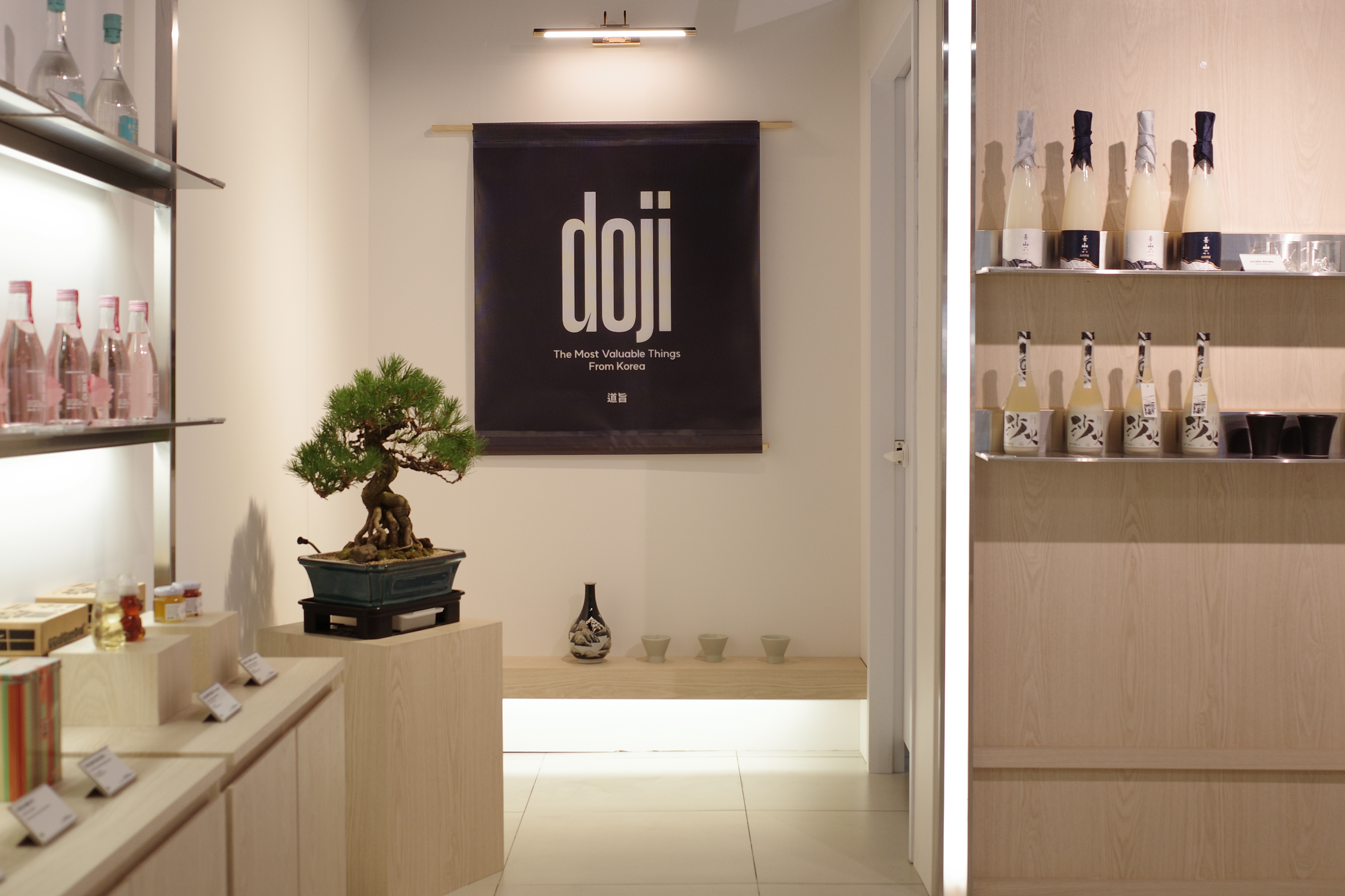 한국 음악과 한국 화장품에 이어 한국 술까지 구경했습니다. 국내의 다양한 우리 술을 모아서 소개하는 전통주 편집숍 ‘DOJI’예요. 차분하고 단정한 우드 인테리어가 주변의 다른 매장들과는 사뭇 다른 분위기를 풍기네요.