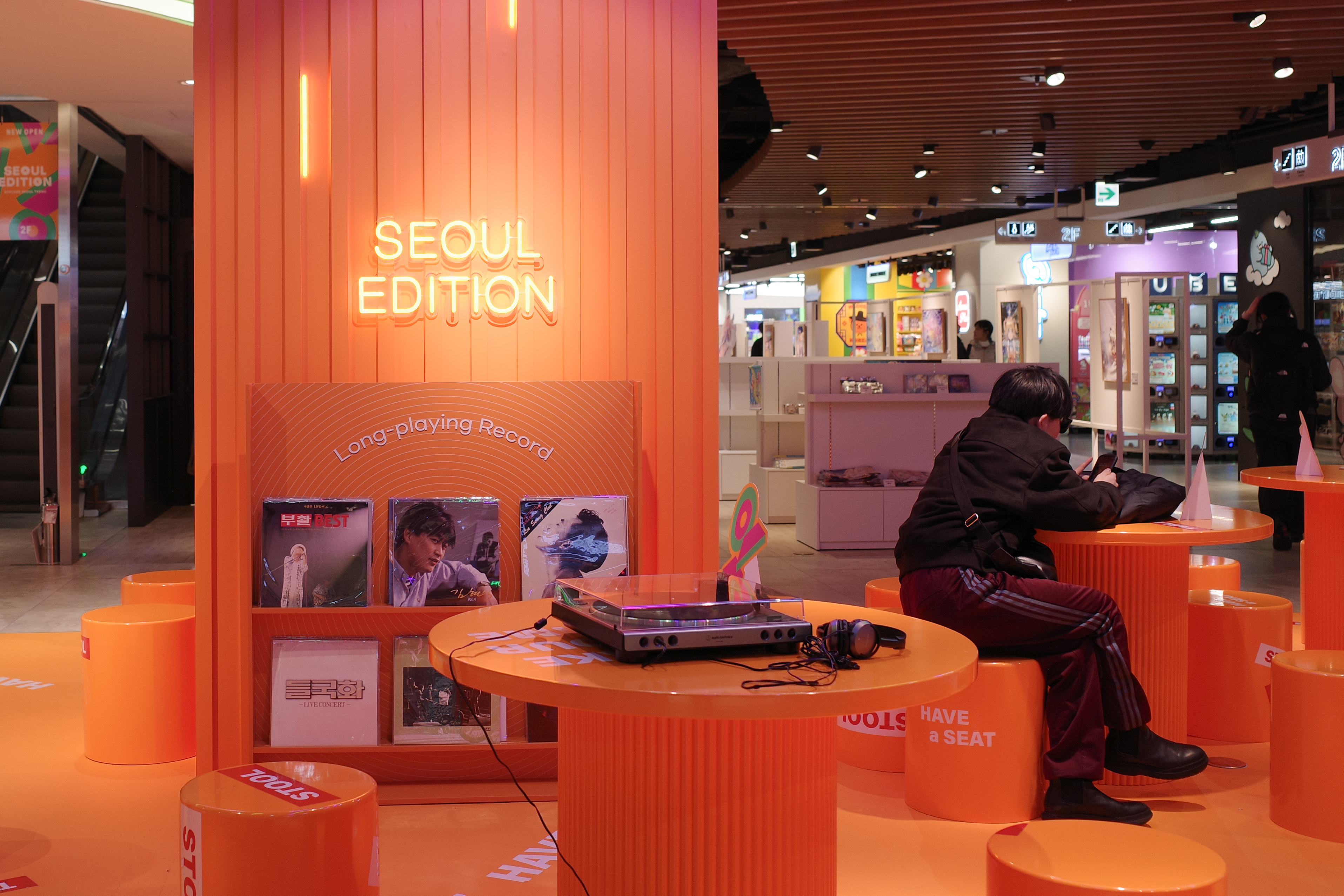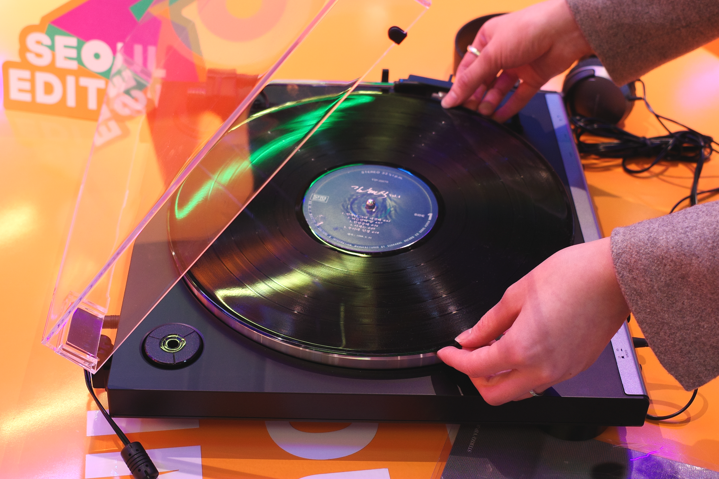 이번에는 한쪽 벽에 진열된 LP를 들고서 턴테이블과 헤드폰이 놓인 테이블에 자리를 잡고 앉아 봅니다. 듣고 싶은 음반을 직접 청음 해볼 수 있어 쇼핑 중에 쉬어가는 시간이 지겹지 않을 것 같네요. 김현식, 들국화, 신촌블루스, 김완선 등 한국 대중음악사의 중요한 뮤지션과 앨범을 소개하고 있는데요. 동대문을 대표하는 레코드숍 ‘모자이크 서울’이 직접 큐레이팅을 맡았다고 하니 옛날 음악을 애정하는 분들이라면 그냥 지나칠 수 없겠죠?