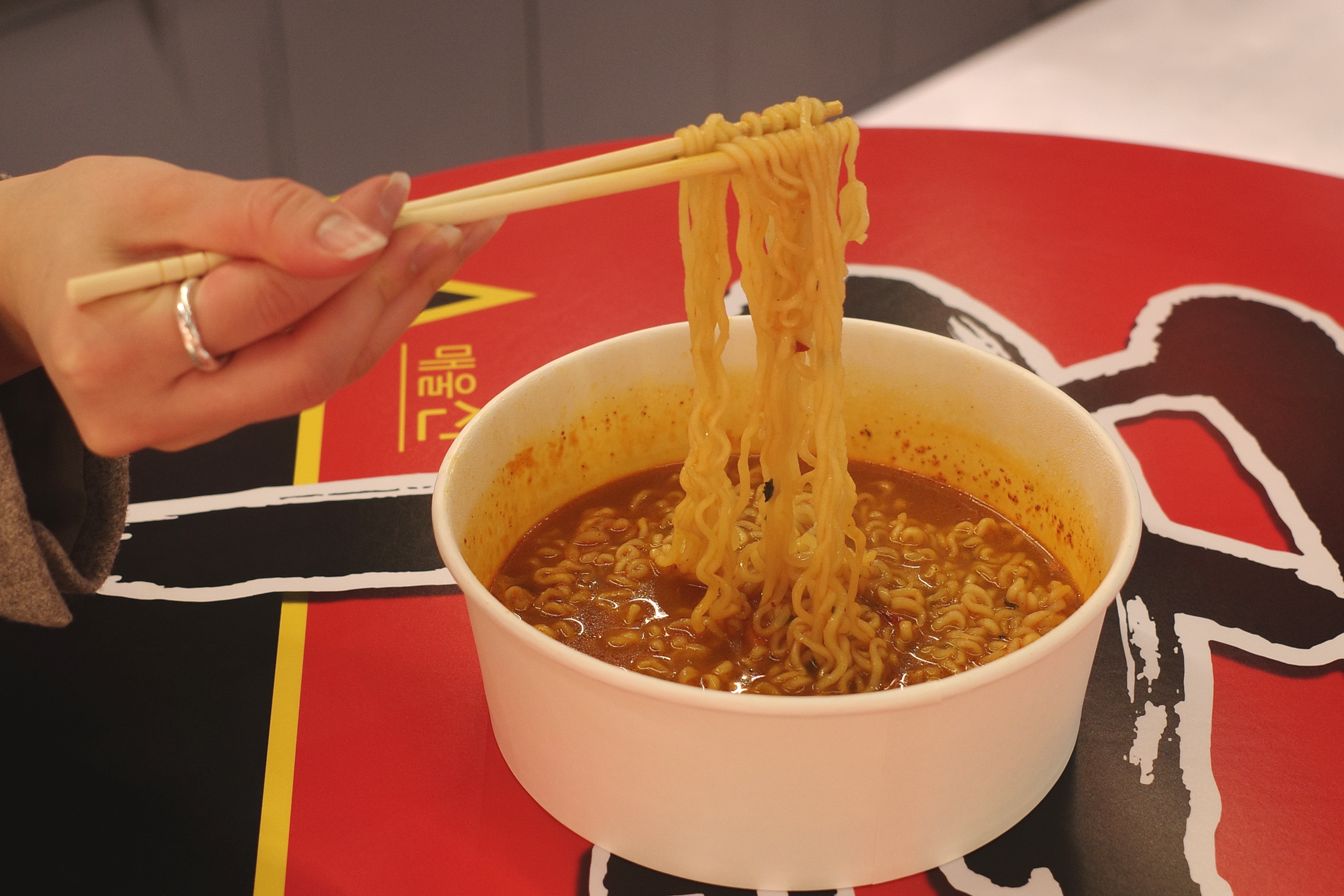 마음에 드는 라면을 구매 후 라면 용기를 받아 셀프라면존으로 향해 보세요. 원하는 토핑과 라면을 용기에 담고 셀프 라면 조리기만 가동하면 끝이랍니다. 작동 방법이 세세하게 적혀 있는 만큼 전혀 어렵지 않아요. 거대한 컵라면 형상의 스탠딩 테이블에 기대, 얼큰한 신라면 한 그릇을 후루룩 흡입해 볼까요?