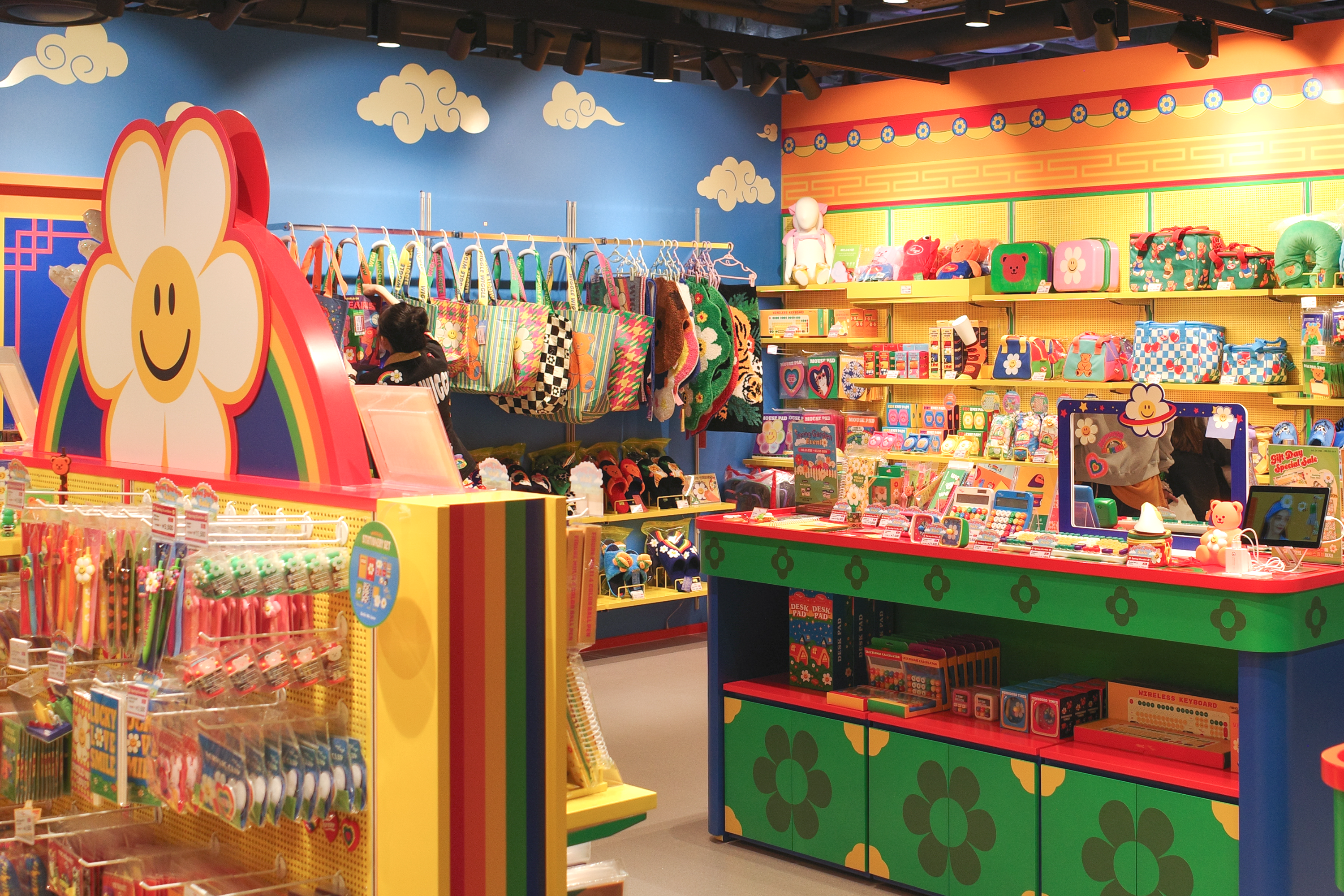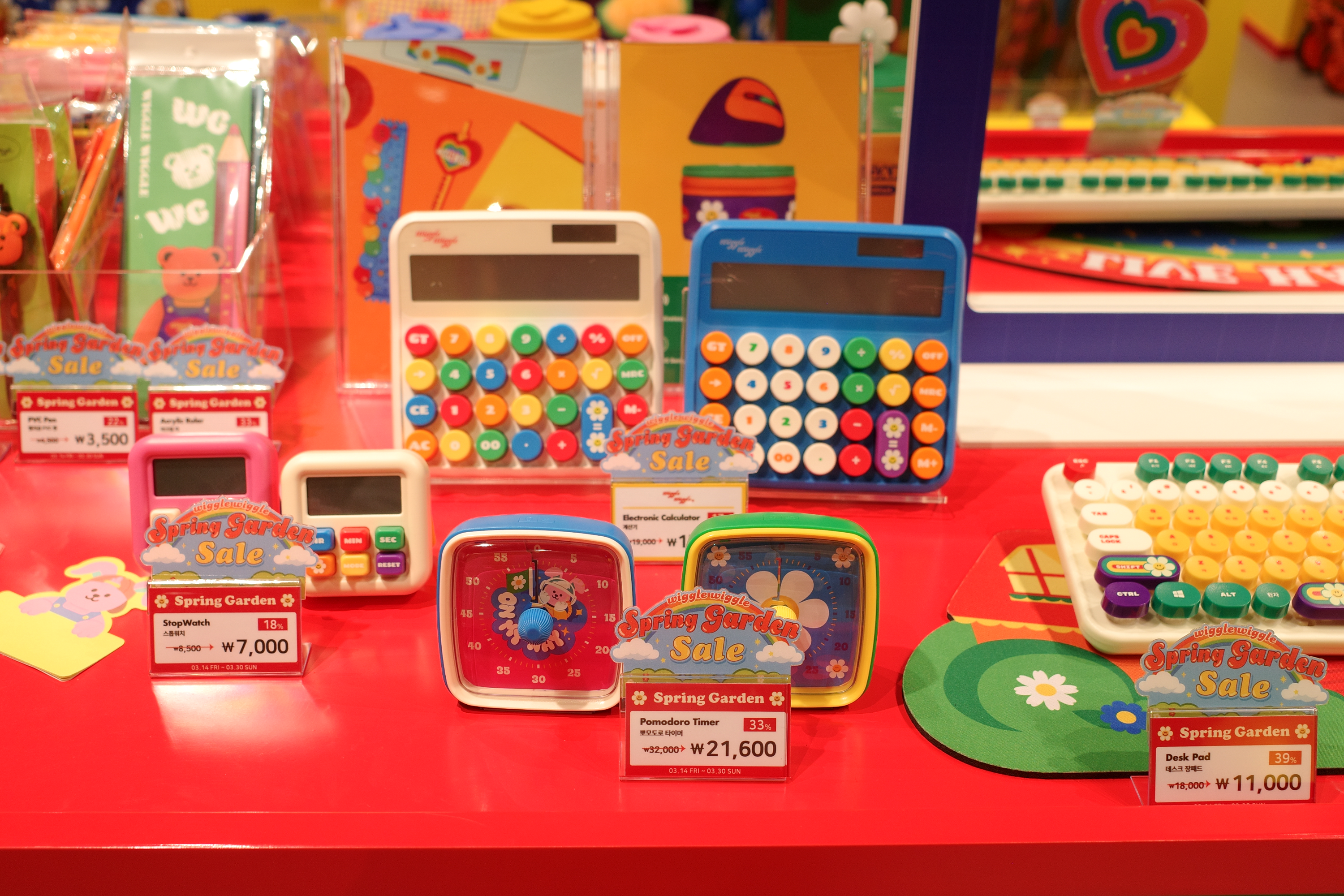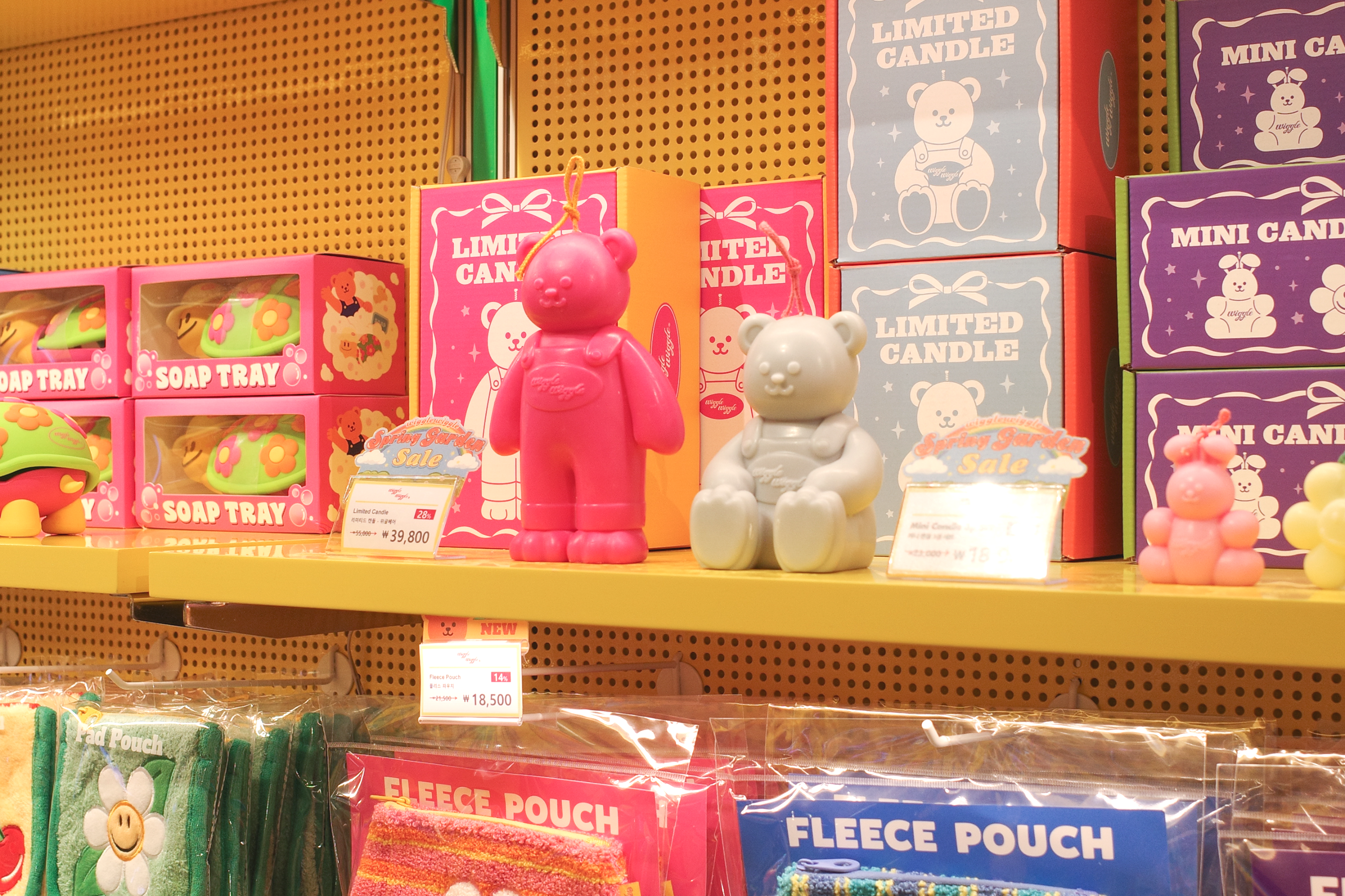 갓을 쓴 곰돌이와 한옥의 기와지붕 등 한국의 전통 요소를 위글위글만의 유쾌한 감각으로 재해석한 인테리어가 돋보입니다. 바로 이곳 현대아울렛 동대문에만 적용되어 있는 인테리어 디자인입니다. 매대와 선반을 빼곡히 채운 잡화류와 문구, 생활 소품의 종류가 워낙 다양해 하나하나 둘러보는 재미가 있어요.