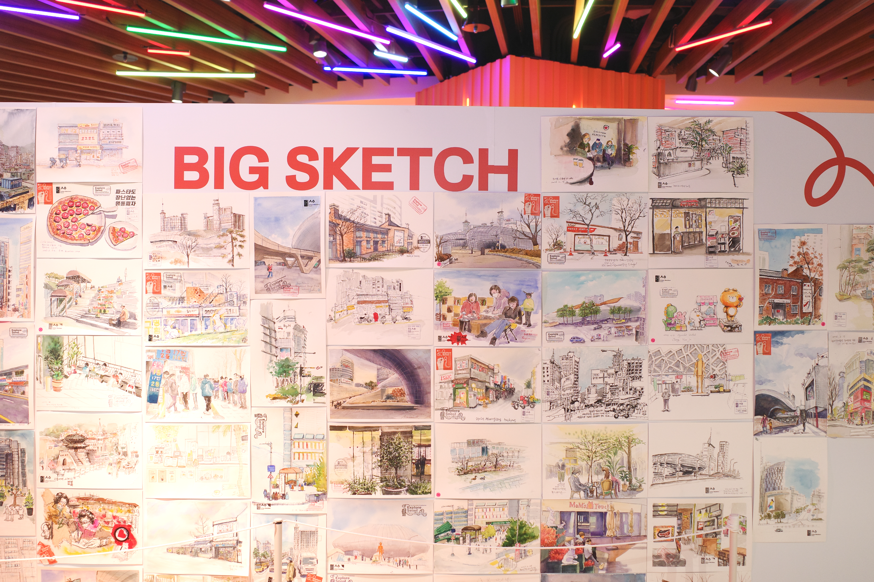책 모양으로 세워진 구조물을 여러 스케치 그림이 채우고 있네요. 자세히 보니 저마다의 시선으로 서울의 풍경을 표현한 그림들입니다. 눈앞의 장면을 자유롭게 그림으로 기록하는 이들의 커뮤니티 ‘어반스케쳐스 서울’의 작품이라고 해요. 동대문의 과거와 현재, 미래를 아우르는 그림들을 보고 있자니 익숙하게 여겨졌던 서울이라는 도시가 또 새롭게 보이는 것만 같습니다.