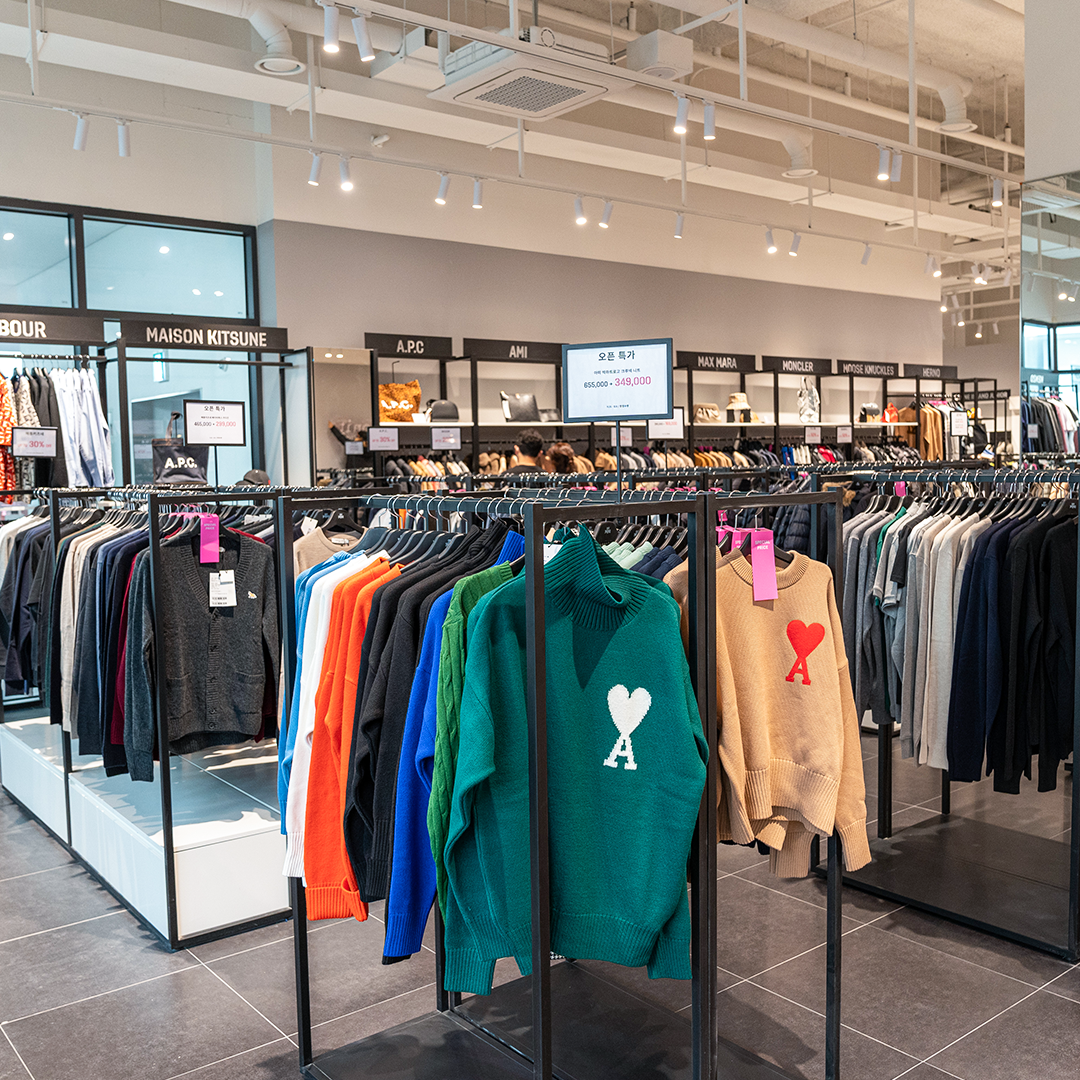 트렌디 컨템포러리로는 하트 모양과 영문 A가 더해진 로고로 유명한 아미가 대표적입니다. 또, 동양풍의 밝고 화사한 스타일의 겐조, 가벼우면서도 포멀한 프렌치 스타일의 메종키츠네 역시 큰 인기를 구가하고 있죠. 그 외에도 아크네 스튜디오 A.P.C., 바버, 세인트제임스, 꼼데가르송 플레이 필립모델, 프리미아타, 오프화이트 등 MZ세대의 이목을 사로잡는 핫한 브랜드의 제품들이 기다리고 있습니다.