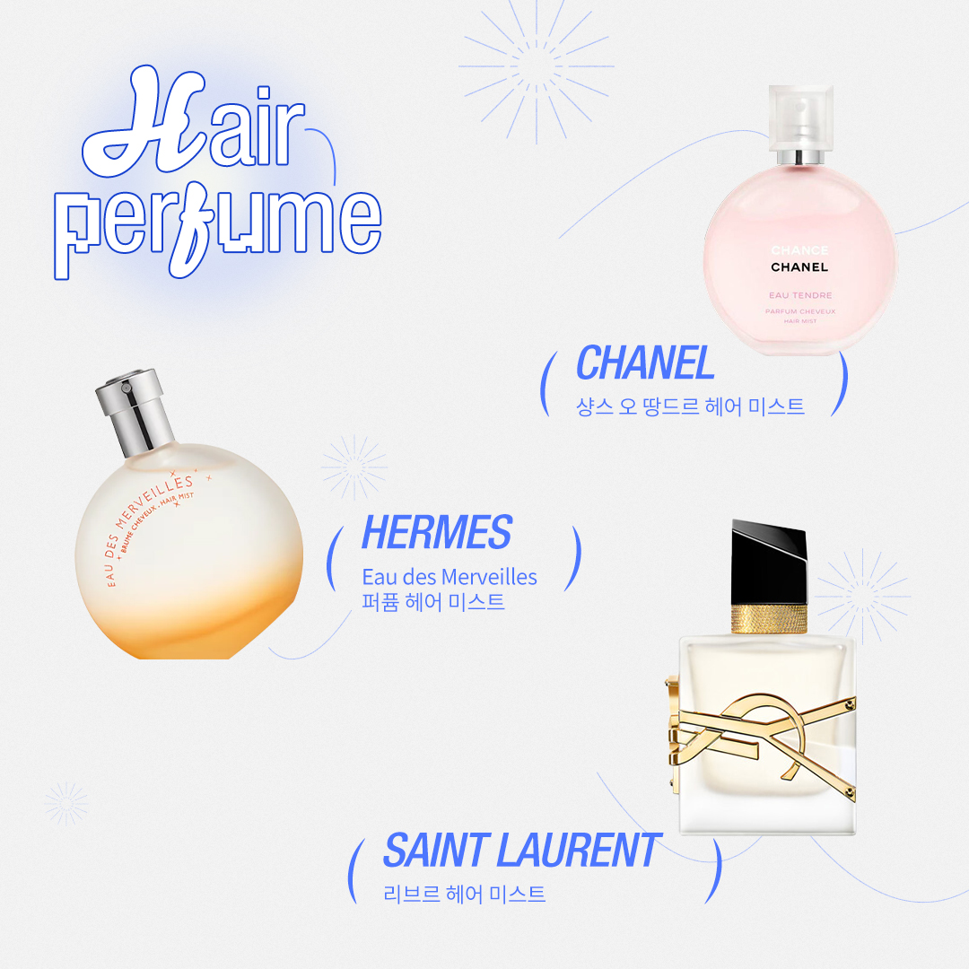 05 에르메스 Eau des Merveilles 퍼퓸 헤어 미스트 휴대가 간편한 보틀에 담겨 있어 가방에 담아 외출하기에도 좋은 아이텝입니다. 서양수수꽃다리 추출물 성분이 첨가되었으며, 드라이하면서 스파이시한 향기가 산뜻한 여름을 완성해 줍니다.