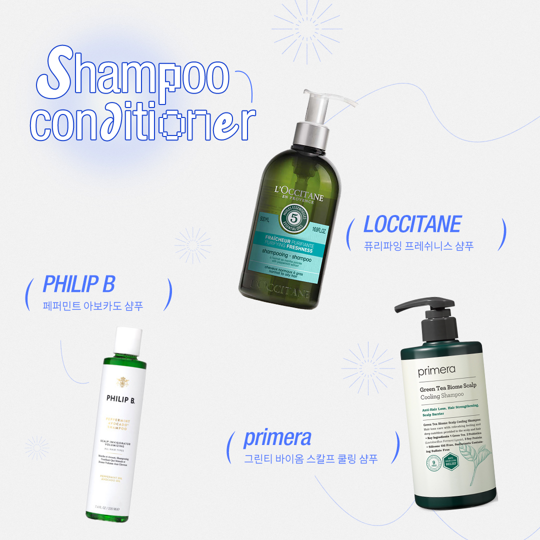 01 르네휘테르 아스테라 프레쉬 수딩 및 쿨링 샴푸 두피에 열감이 있는 사람이라면 이 샴푸를 사용해 보세요. 두피에 바르는 순간 일시적으로 두피 온도를 2.5도 낮춰주는 제품으로, 유칼립투스 오일과 페퍼민트 오일 성분이 두피에 산뜻한 쿨링 효과를 가져다줍니다.