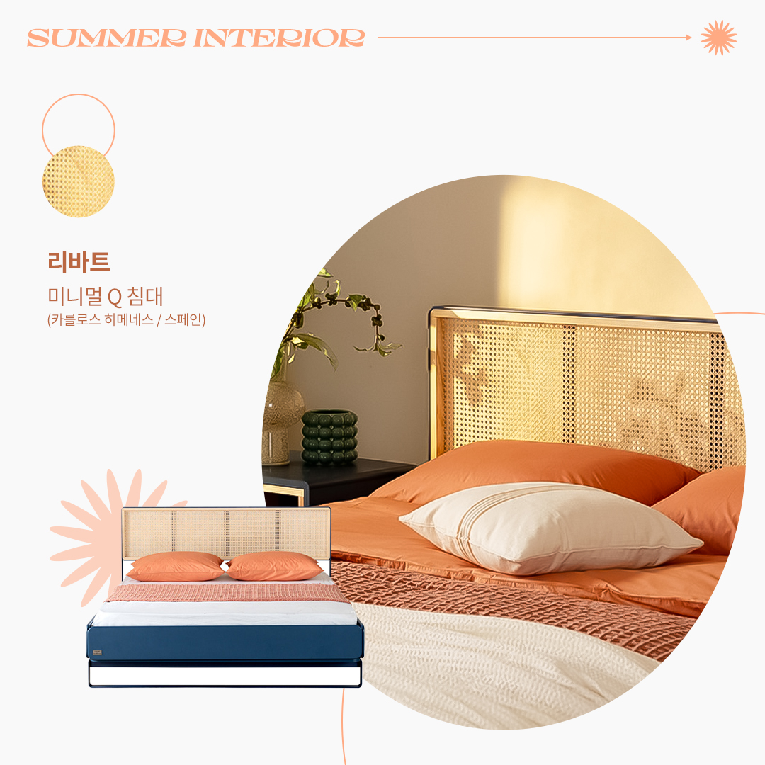 집 분위기에서 가장 큰 비중을 차지하는 것은 바로 가구인데요. 이번 여름을 맞이해 확실하게 인테리어 변신을 해보고 싶다면 시원한 무드가 담긴 가구로 바꿔보세요. 리바트와 스페인 디자이너 카를로스 히메네스의 협업으로 탄생한 미니멀 Q 침대는 스페인 자연을 닮은 경쾌한 컬러가 특징이며, 미니멀리즘을 기반으로 한 간결함은 세련된 분위기를 자아냅니다. 천연 라탄 소재가 사용되어 시원하면서도 편안함을 느낄 수 있습니다. 침대 제품 바로가기