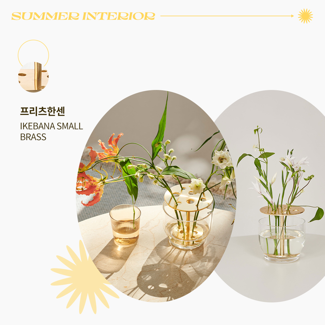 크기가 작은 포인트 아이템은 계절에 따라 쉽게 바꿀 수 있기 때문에 시즈널 인테리어로 활용하기 좋습니다. 스페인의 유명 디자이너 하이메아욘이 디자인한 프리츠한센의 이케바나 화병은 꽃뿐만 아니라 줄기와 화관까지 꽃 전체를 즐길 수 있도록 제작되었는데요. 꽃을 꽂을 수 있는 스틸 부분은 고급스러움을 더해주며, 꽃의 길이나 크기에 따라 다양한 꽃꽂이를 연출할 수 있습니다. 화병 제품 바로가기