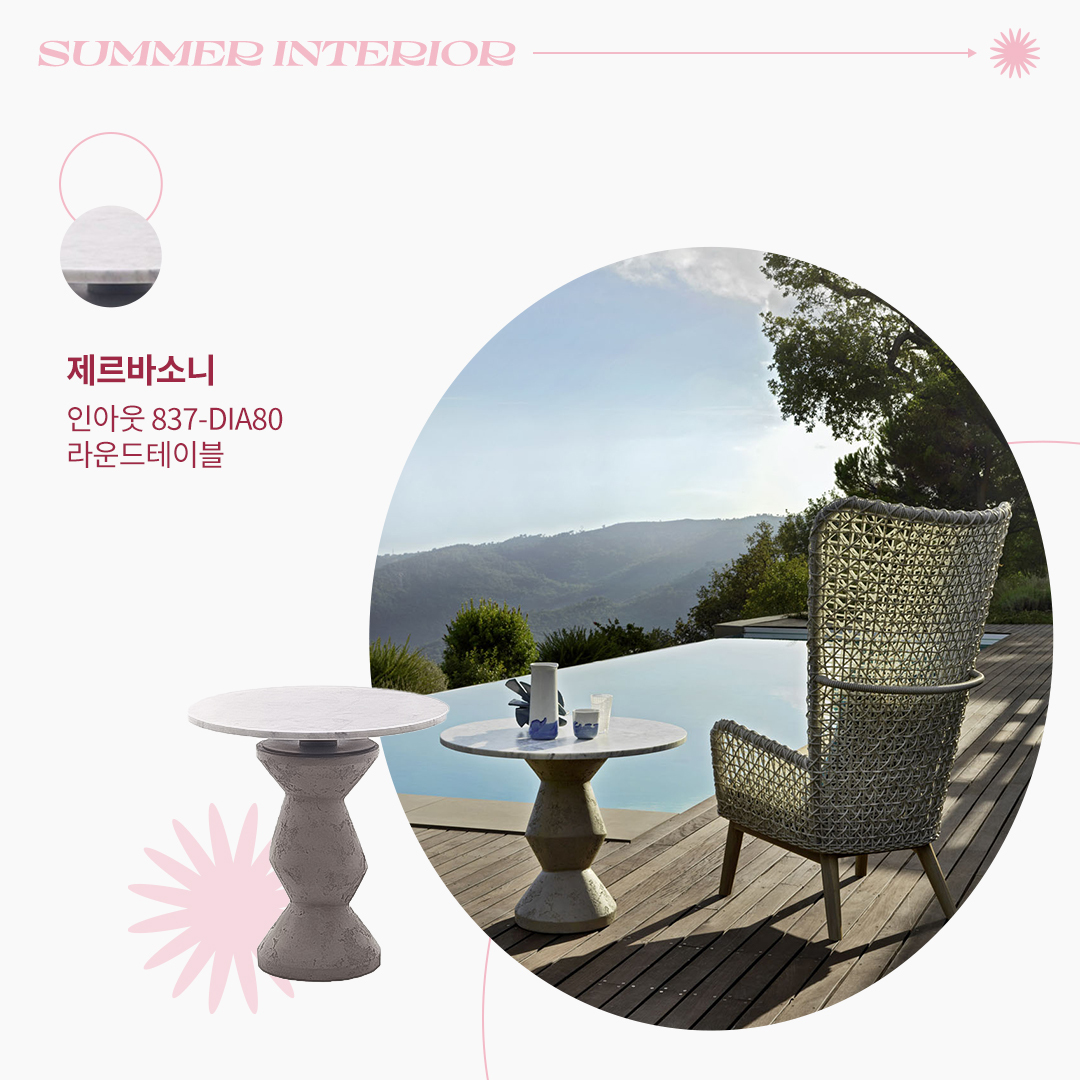 시원한 실내에서 티타임을 즐기는 시간이 많아지는 여름날에 가장 필요한 가구가 있다면 그건 바로 편안한 시간을 보낼 수 있는 ‘테이블’일 거예요. 이탈리아 가구 브랜드 제르바소니는 자연에서 온 소재로 가구를 만드는데요. 이 라운드테이블은 천연 대리석으로 만들어져 집 전체에 시원한 분위기를 전해줍니다. 제르바소니의 라운드테이블로 무더운 여름날 더욱 시원하게 티타임을 즐겨보세요. 테이블 제품 바로가기