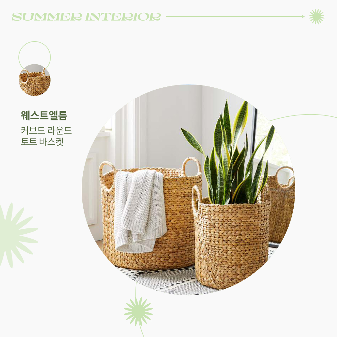 워터 히아신스로 만들어진 웨스트엘름의 커브드 라운드 토트 바스켓도 여름 인테리어를 완성하기 좋은 포인트 아이템입니다. 자연스러운 마감으로 깔끔하며, 둥근 손잡이는 물건을 더욱 편리하게 옮기도록 해줍니다. 옷이나 생활용품을 웨스트엘름의 바스켓에 담아 보관하여 공간을 깔끔하게 정리해 보세요. 바스켓 제품 바로가기