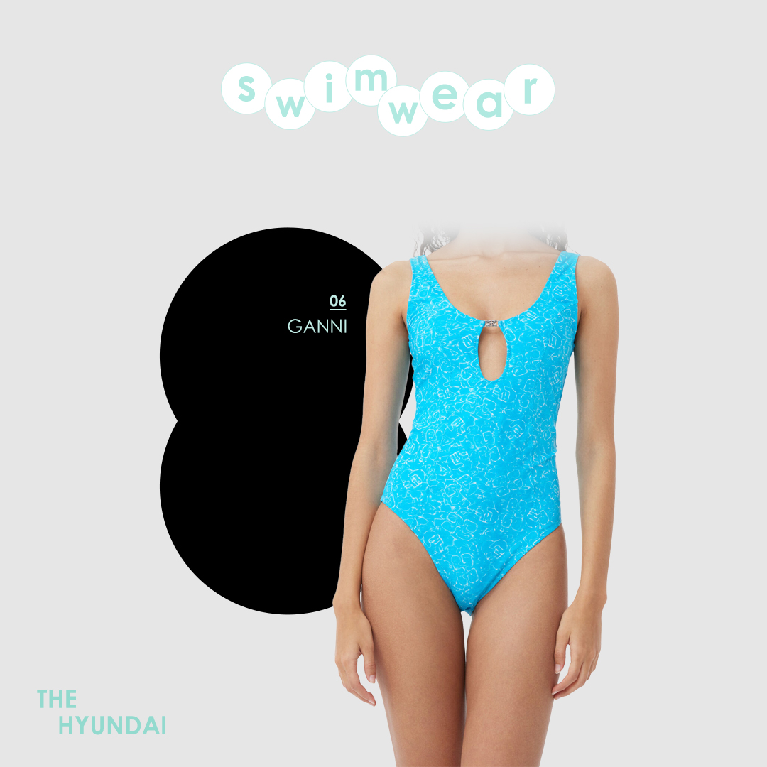 남들과는 다른 스타일의 모노키니를 찾고 있다면 이 아이템이 제격입니다. 가니의 이 수영복은 벨기에 디자인 듀오 ‘에스터 마나스’와 협업한 아이템인데요. U넥 라인과 더불어 전면의 버클 장식과 컷아웃이 절묘한 조화를 이루고 있어요. 오션 블루의 컬러에 가니의 프린트가 감각적인 포인트가 되어주고 있죠.