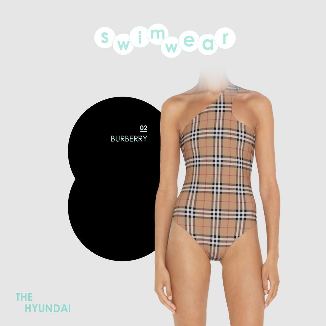 원숄더 스타일의 수영복은 어떨까요. 버버리의 이 아이템은 브랜드 특유의 아이코닉한 하우스 코드인 버버리 체크가 원단 전체를 덮고 있습니다. 그로 인해 클래식한 이미지로 연출할 수 있는데요. 원숄더에 왼쪽 어깨 라인이 과감하게 커팅되어 유니크한 느낌까지 낼 수 있습니다.