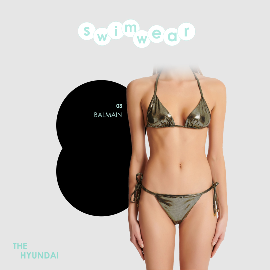 화려한 존재감을 뽐내고 싶다면 발망의 메탈릭 비키니도 좋은 선택이 되어줄 거예요. 메탈릭 소재 비키니는 2023년 컬렉션에 등장하며 주목받고 있는 아이템이기도 한데요. 상의는 트라이앵글 캡에 스키니한 스트랩으로 이뤄져 있고 하의는 로우 웨이스트로, 올여름 과감한 스타일에 도전해보고 싶다면 눈여겨보세요.