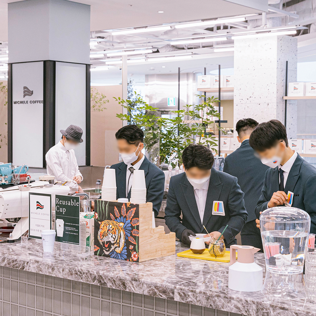 국가대표 바리스타인 정경우 바리스타의 ‘미켈레 커피’가 백화점 최초로 ‘더현대 서울’에 안착했습니다. ‘미켈레 커피’에서는 바리스타들이 모두 정장을 입고 있는데요, 커피를 대하는 진지한 자세가 엿보이는 것 같죠? ‘미켈레 커피’에서는 정경우 바리스타가 다양한 소스에서 영감을 받아 예술작품으로 탄생시킨 다양한 커피를 만날 수 있습니다. 제한된 시간 내에만 판매하는 ‘미켈레 시그니처 아메리카노’, 달콤한 크림이 풍성한 ‘알 라떼’, 서울랜드에서 아이들이 가지고 놀던 버블건에서 영감을 받은 ‘서울랜드’ 등, ‘미켈레 커피’에서는 한 잔의 음료도 커피에 대한 애정과 예술적 상상력이 만난 작품입니다.