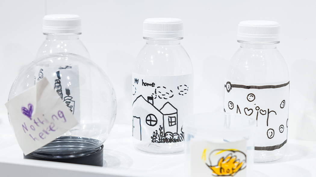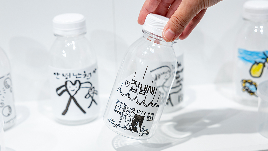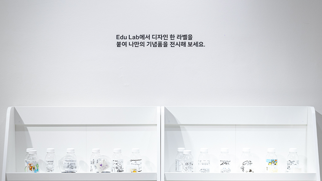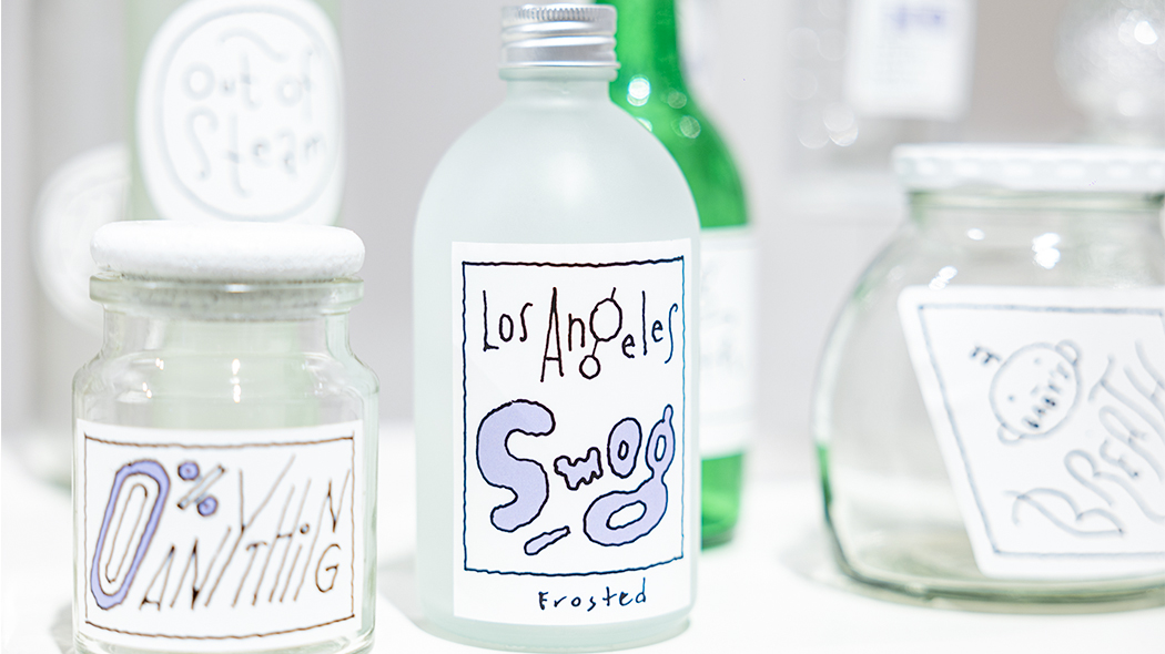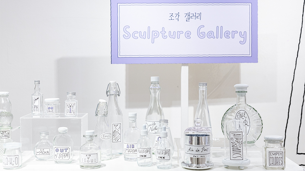 <조각 갤러리>는 비어 있는 좌대와 텅 빈 유리 쇼케이스로 구성된 공간인데요. 빈 병에 붙어 있는 라벨을 하나하나 읽어 볼까요? 런던의 안개, LA의 스모그, 뉴욕의 공기 등 아무것도 없는 것 같았던 빈 병들이지만, 그 안에는 우리가 보지 못했던 주변의 존재들이 한가득 담겨 있습니다.