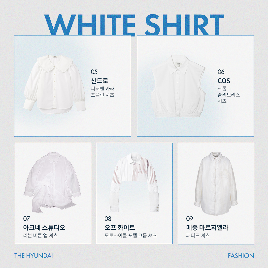 05 산드로 피터팬 카라 포플린 셔츠 귀여운 스타일을 선호한다면 산드로의 포플린 셔츠를 추천합니다. 프릴 장식의 와이드 칼라로 로맨틱한 느낌을 연출할 수 있는데요. 주름이 잡힌 볼륨 소매와 와이드 커프스는 손목 라인을 강조하며 팔뚝이 가늘어 보이게 만들어 줍니다. 앞과 뒤가 다른 기장감을 포인트로 살려 스타일링 하기에도 유용해요.