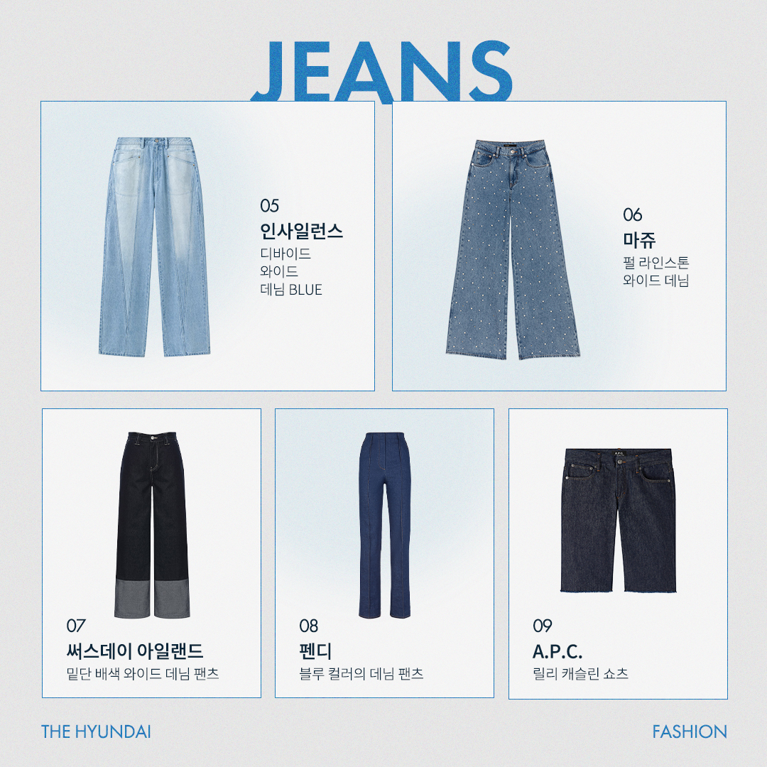 05 인사일런스 디바이드 와이드 데님 BLUE 인사일런스의 와이드 데님은 스타일리시한 룩을 완성하기에 좋은 아이템입니다. 통이 넓지만 직선 형태의 디바이드 디테일이 적절하게 들어가 있어 둔해 보이지 않고, 힐이나 워커와 매치하면 다리를 더욱 길어 보이게 하는 데 도움이 됩니다. 경쾌한 크롭 타입의 셔츠와 입으면 멋스러운 룩을 만들 수 있죠.