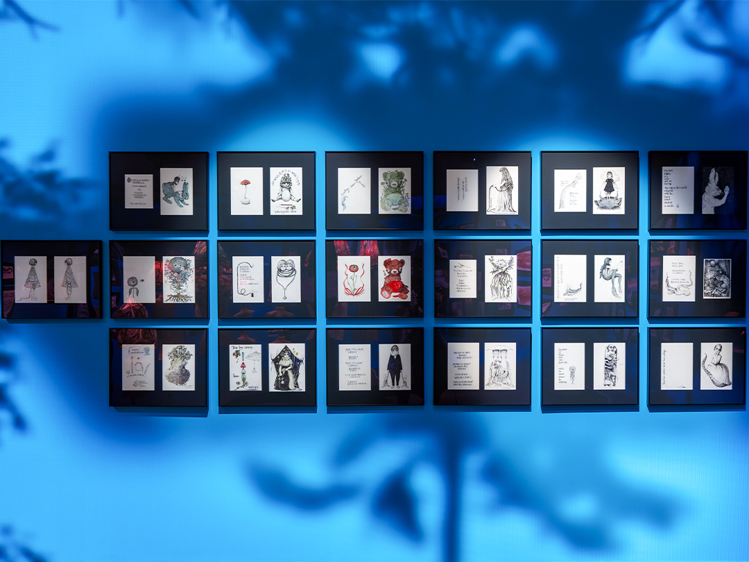 수풀 뒤에서 방문객을 지켜보는 눈동자, 스산하게 너울대는 그림자, 머리 위로 번갈아 뜨는 해와 달, 작가의 실제 갤러리 ‘보리스 잡화점’을 모티브로 한 섹션까지.