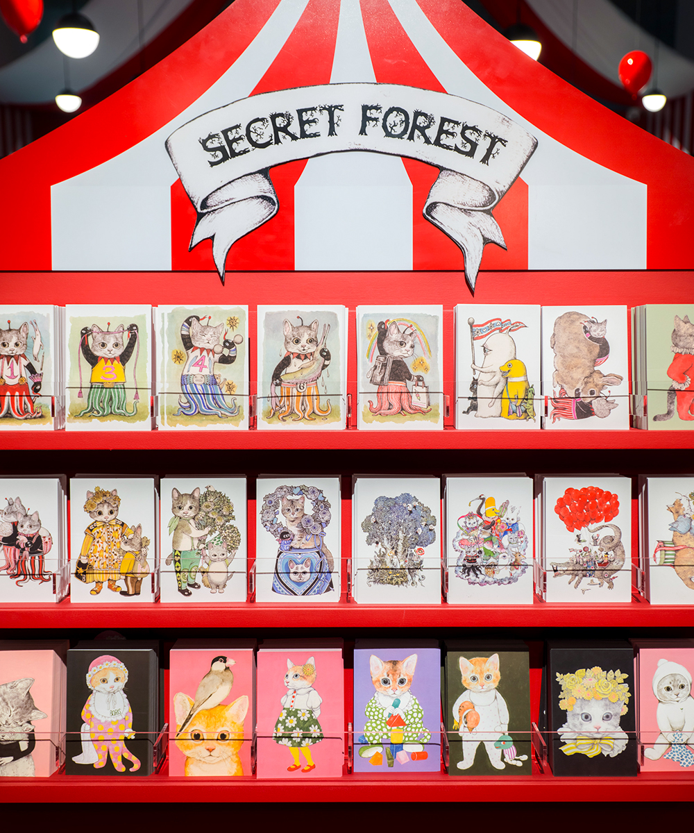 앙증맞은 고양이들이 팔랑팔랑 내려앉은 나무를 지나면 본격적으로 귀여운 동물들이 마중 나옵니다. 색깔이 확실한 초기작부터 여러 브랜드와의 작업물 등 다양한 옷을 갈아입고서요.